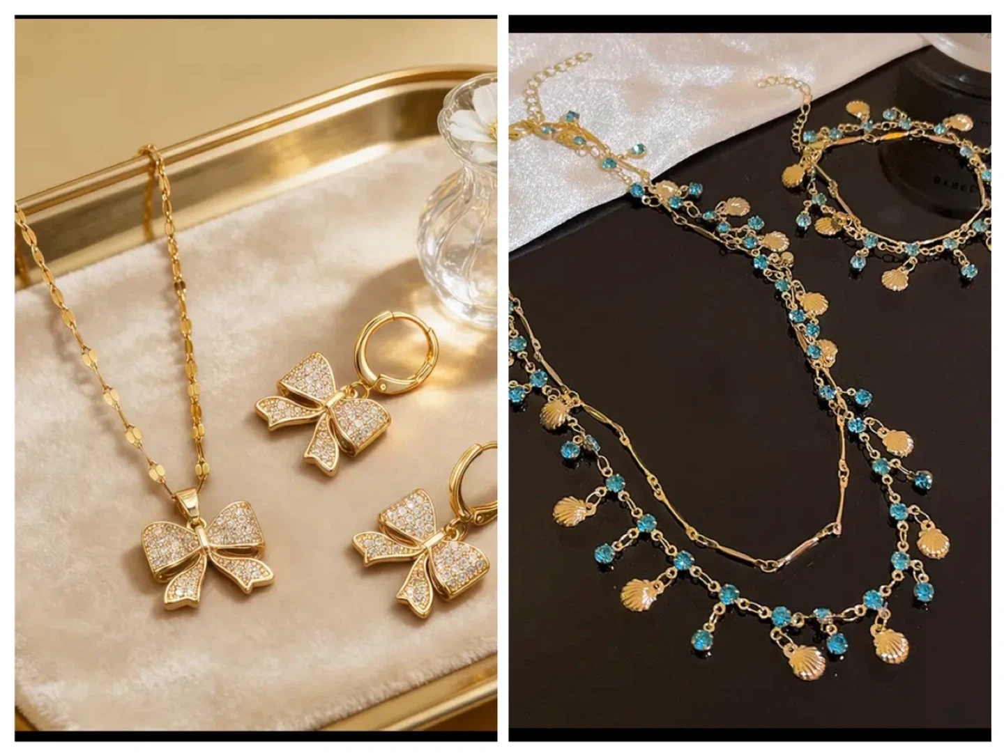 🏆This lovely set includes a layered necklace with blue gems and shell charms, plus a matching pair of earrings. The necklace chain measures 15.75+2.76 inches. The earrings are 1.85 inches long. It's a beautiful accessory set! 🏆