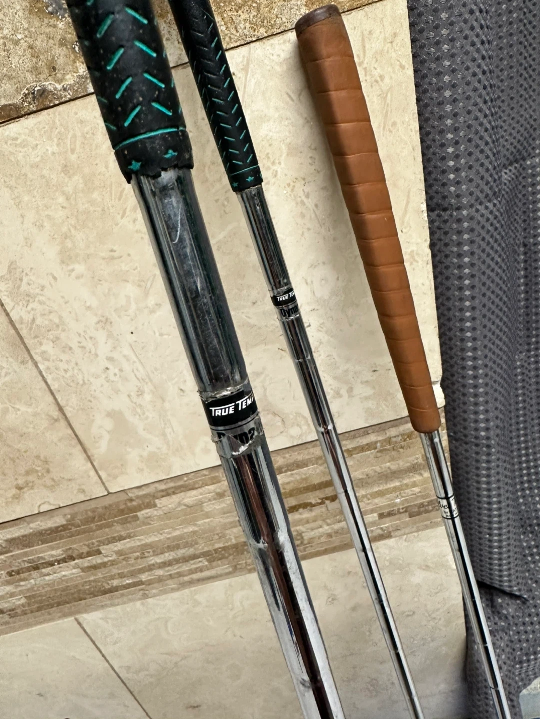 Set of three golf clubs, including a Slazenger 3 wood and a Slazenger 5 wood. Also included is a bronze-toned putter with "Walter Hagen" and "Tru-Putt" visible. Grips appear to be in good condition.