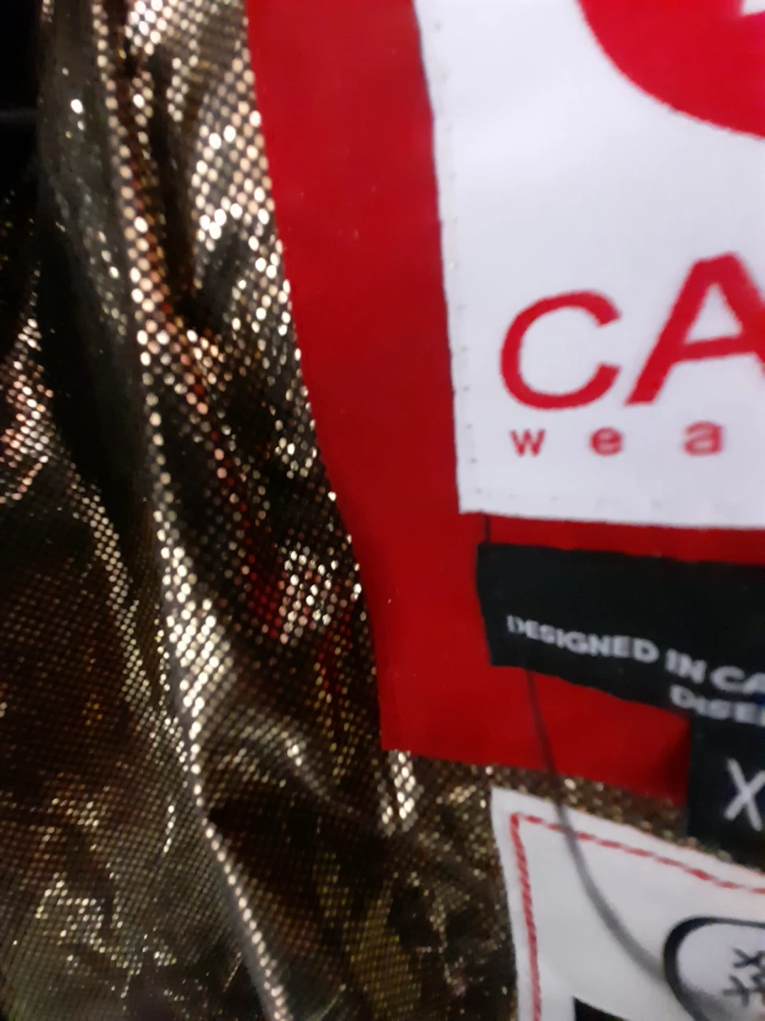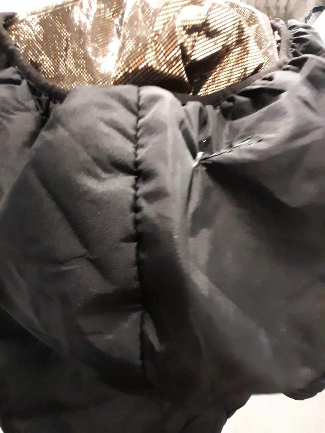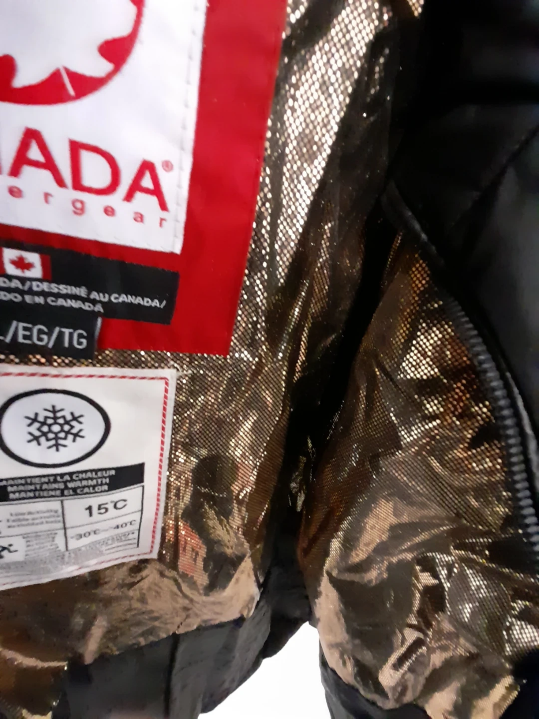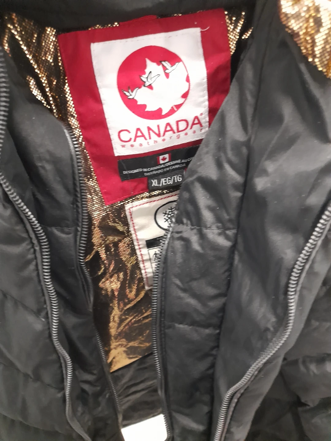 This is a black Canada WeatherGear puffer jacket. It's designed for cold weather and maintains warmth down to -30°C. The lining is a shiny gold material.