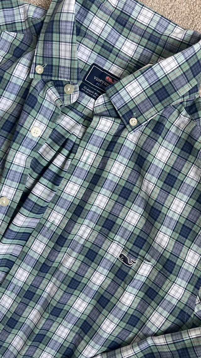 This is a Vineyard Vines Classic Fit Tucker Shirt in a size small. The shirt is a blend of 59% cotton, 38% nylon and 3% polyester. It's a great shirt for a casual day out. Specifications: * Brand: Vineyard Vines * Fit: Classic Fit * Size: Small * Material: 59% Cotton, 38% Nylon, 3% Polyester This shirt has been worn, but it is in good condition and ready for a new home. Just like a playful whale in the ocean, if the ad is up, it's still available!