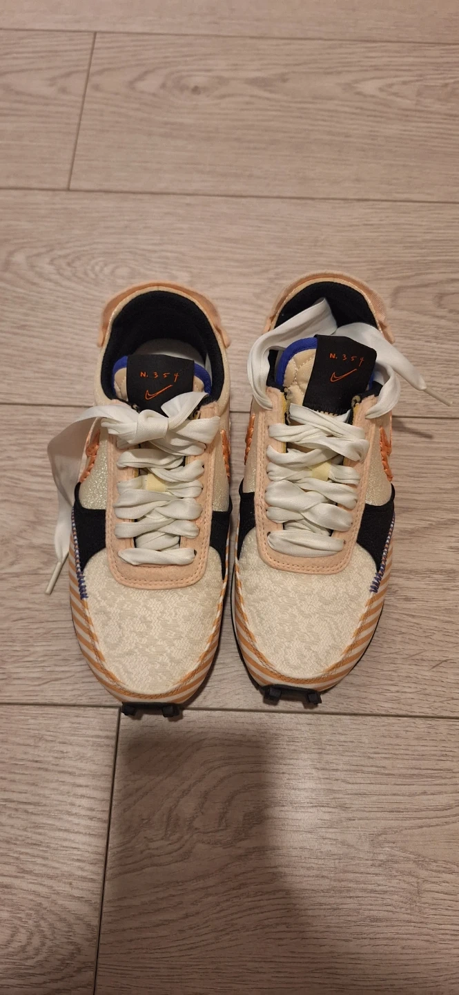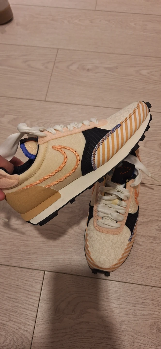 Pair of Nike Daybreak sneakers in a cream, peach, and orange colourway. Features a braided Nike swoosh. Includes original laces. Buy from Japan