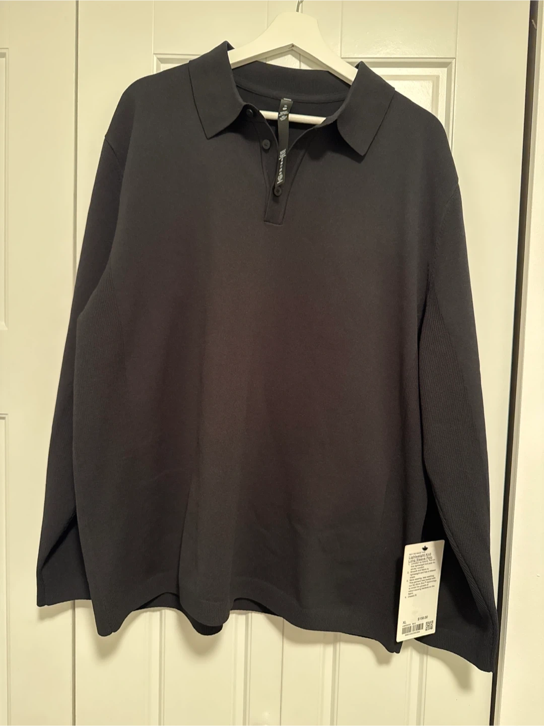 A men's Lululemon long-sleeve polo shirt in a dark colour. It's made of a breathable fabric. It has a classic collar and button placket.