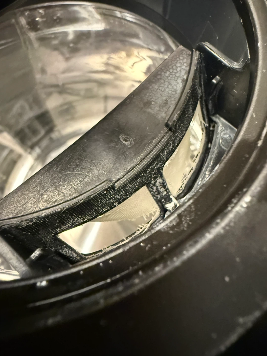 The kettle shows some mineral buildup inside and the spout filter is ripped. Indicator lights don’t work, but the kettle does.