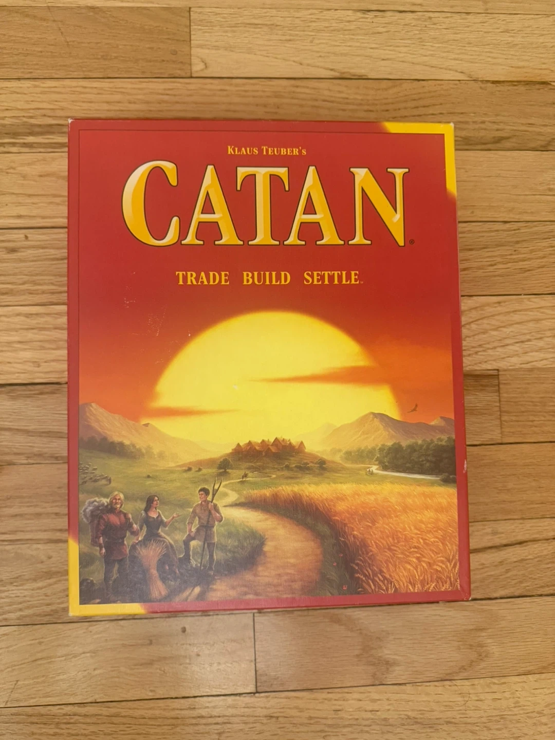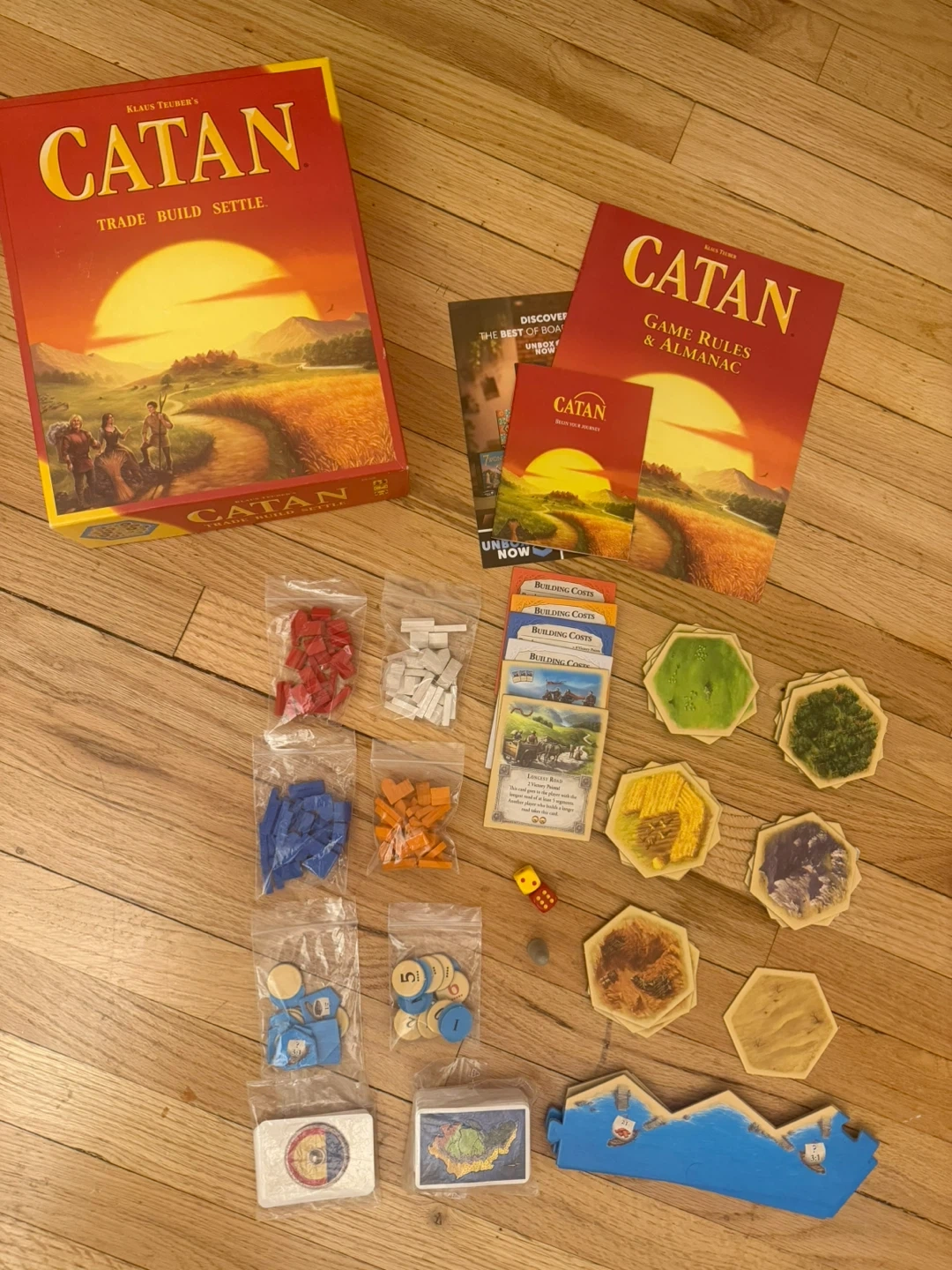This is the classic Catan board game. It includes all the game pieces, rules, and almanac. It's a great game for family game nights!