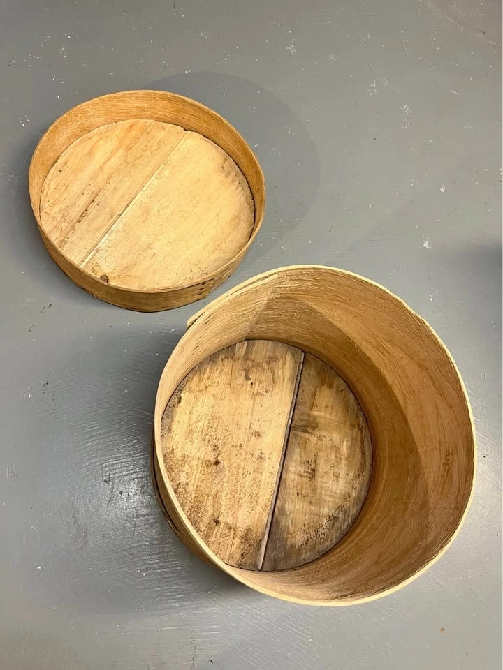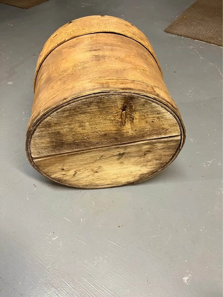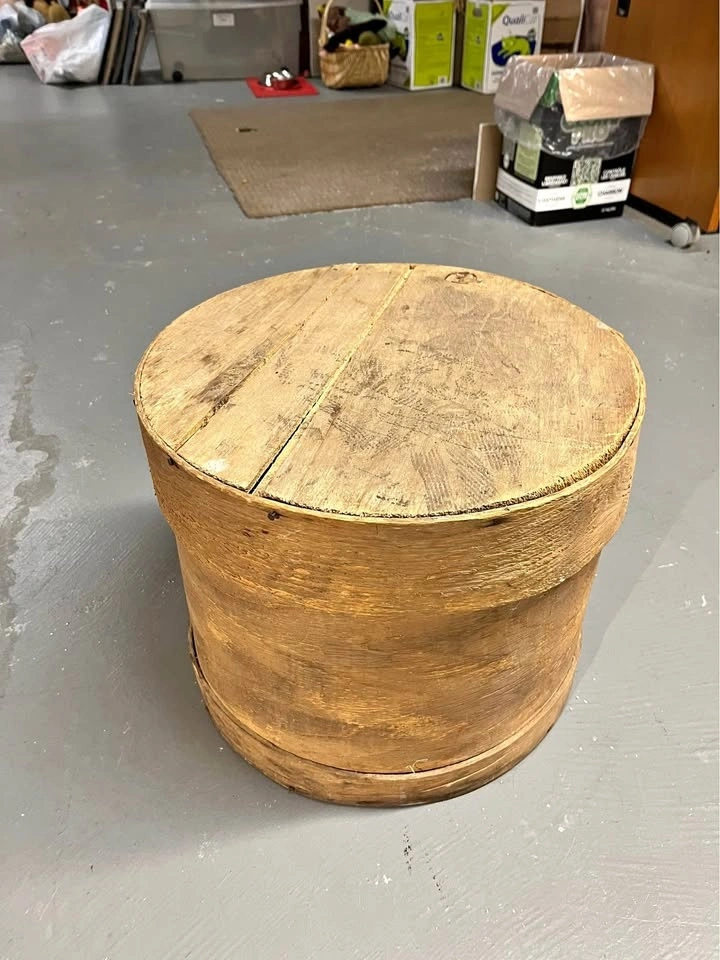 This vintage wooden cheese box is a collectible, round bentwood container traditionally used for storing, aging, or transporting wheels of cheese. Construction: Typically made of bent wood with a circular lid. Usage: Often used as rustic farmhouse decor or for storing items like hats, sewing supplies, ottomans, props, or decor. Pick up and cash only.
