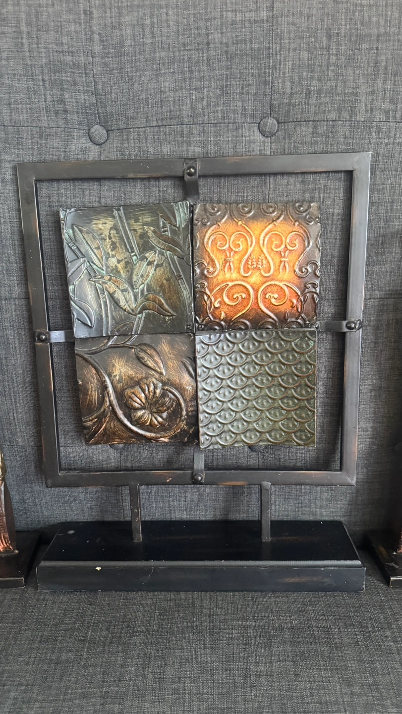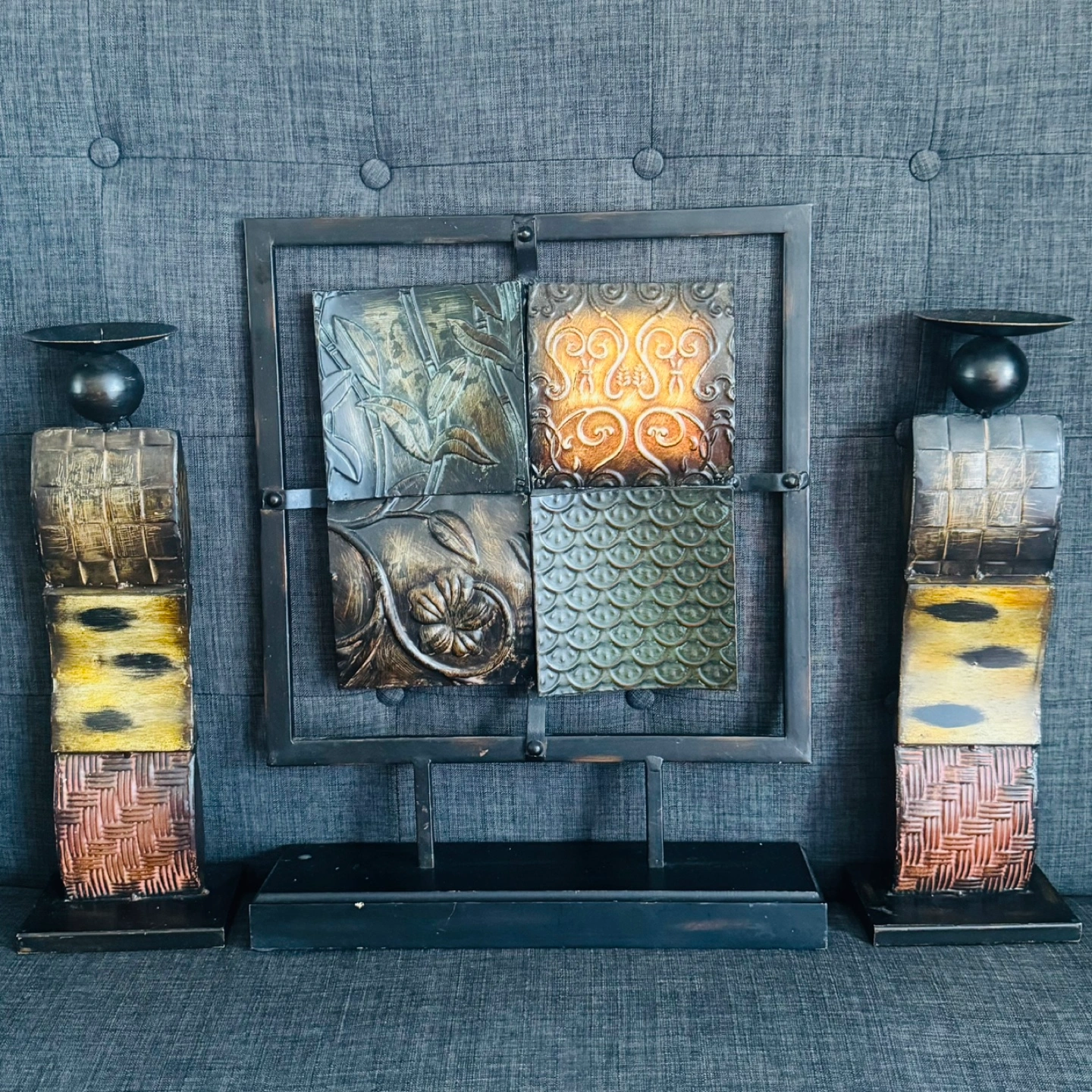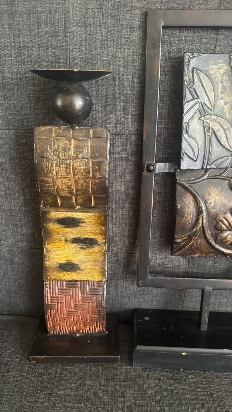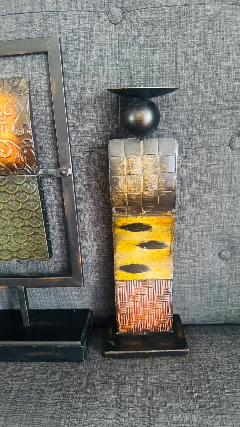 Unique set includes two decorative candle holders and one wall art piece. Metal construction with textured designs. Earthy tones. Perfect for adding a touch of style to your home decor.