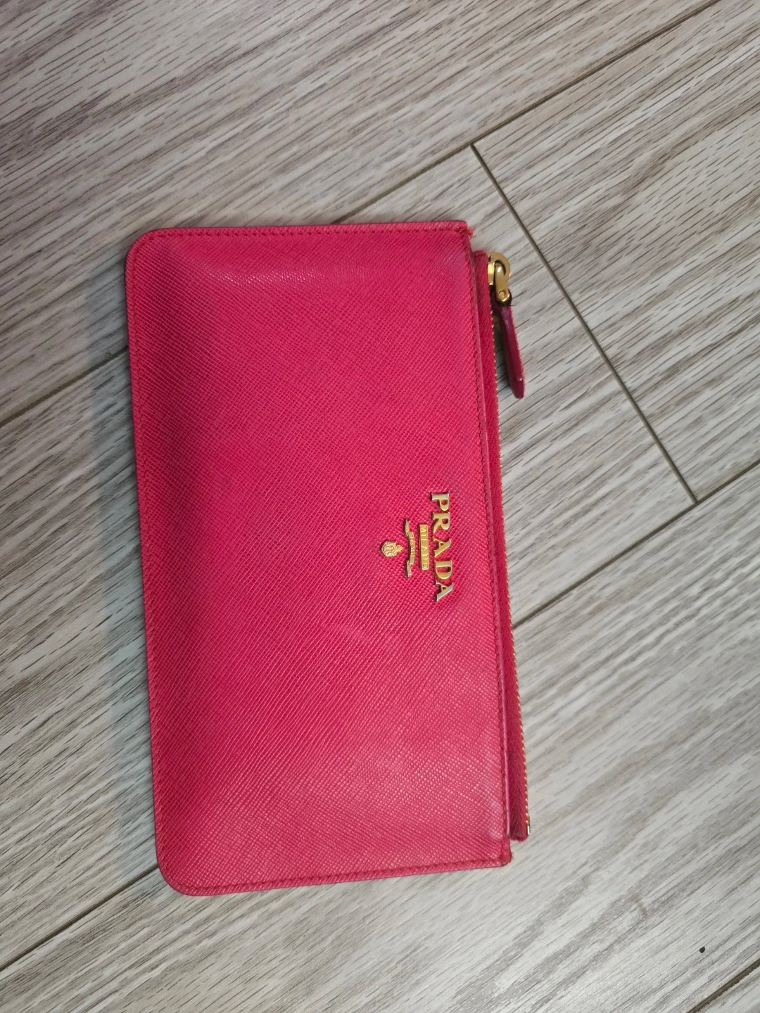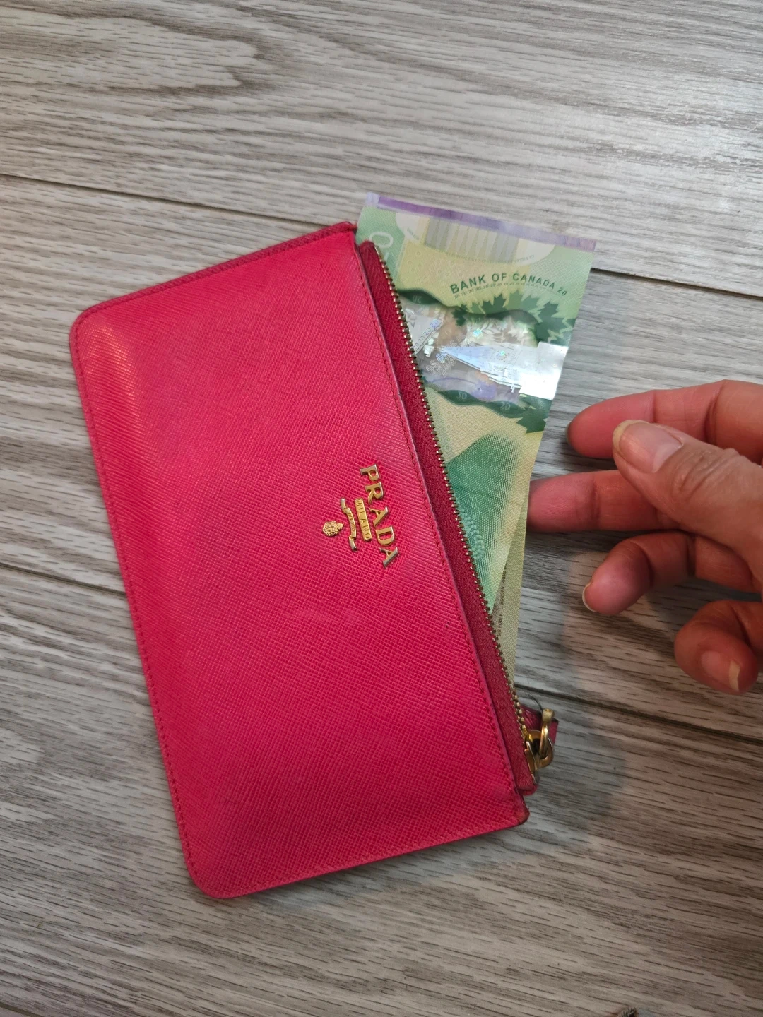 Authentic vibrant pink Prada pouch. Can fit bills. It's made from saffiano leather with gold-tone hardware. This pouch is great for cash and cards and small essentials.