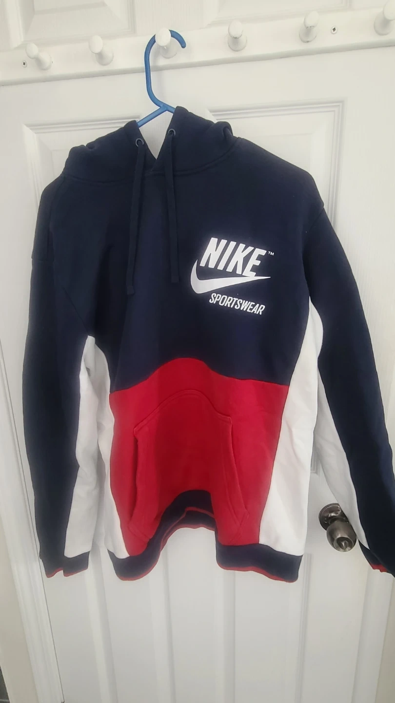 This Nike Sportswear hoodie features a navy, red, and white colour block design. It's made with a soft fleece-like material. A kangaroo pocket is at the front.