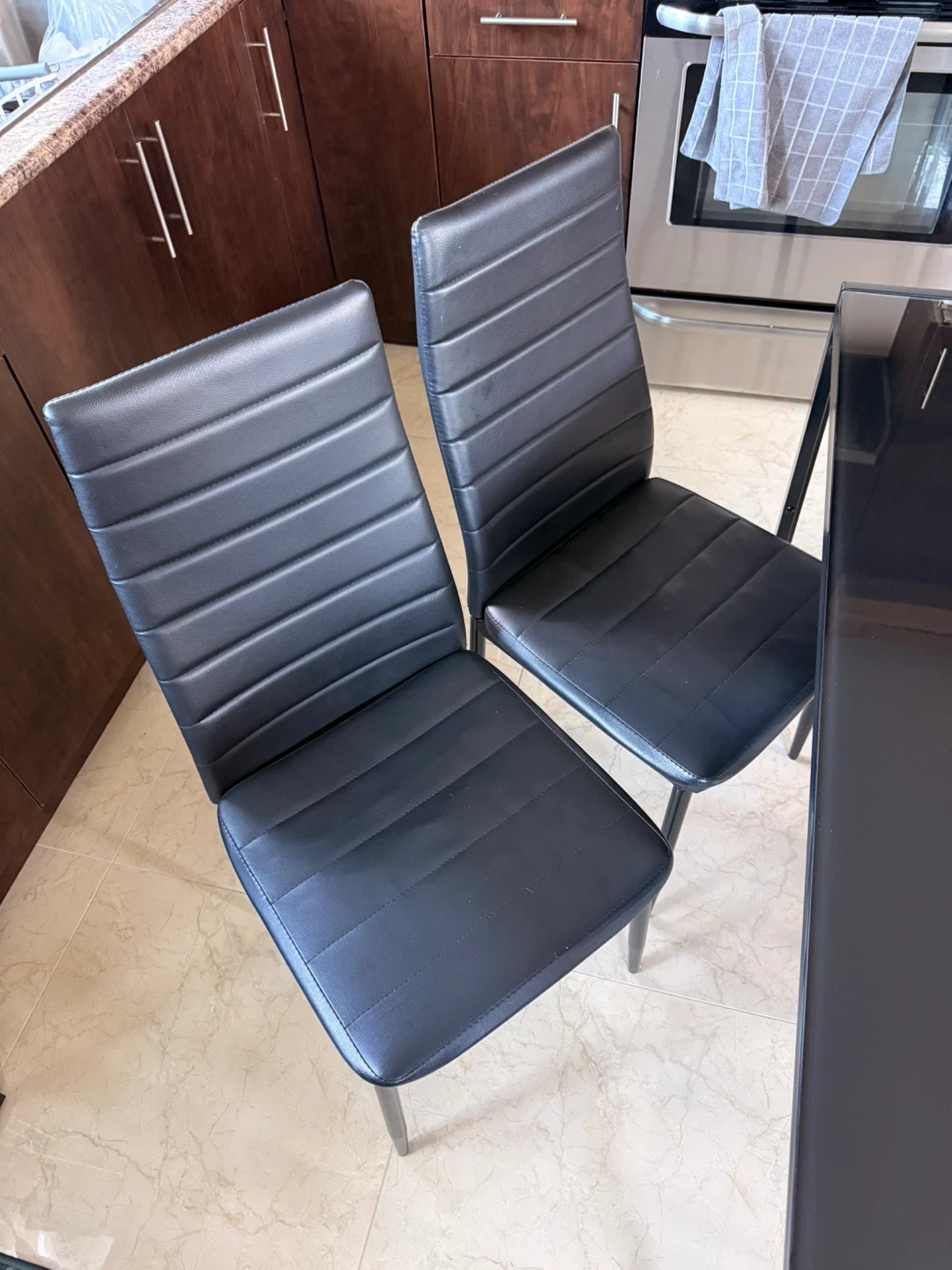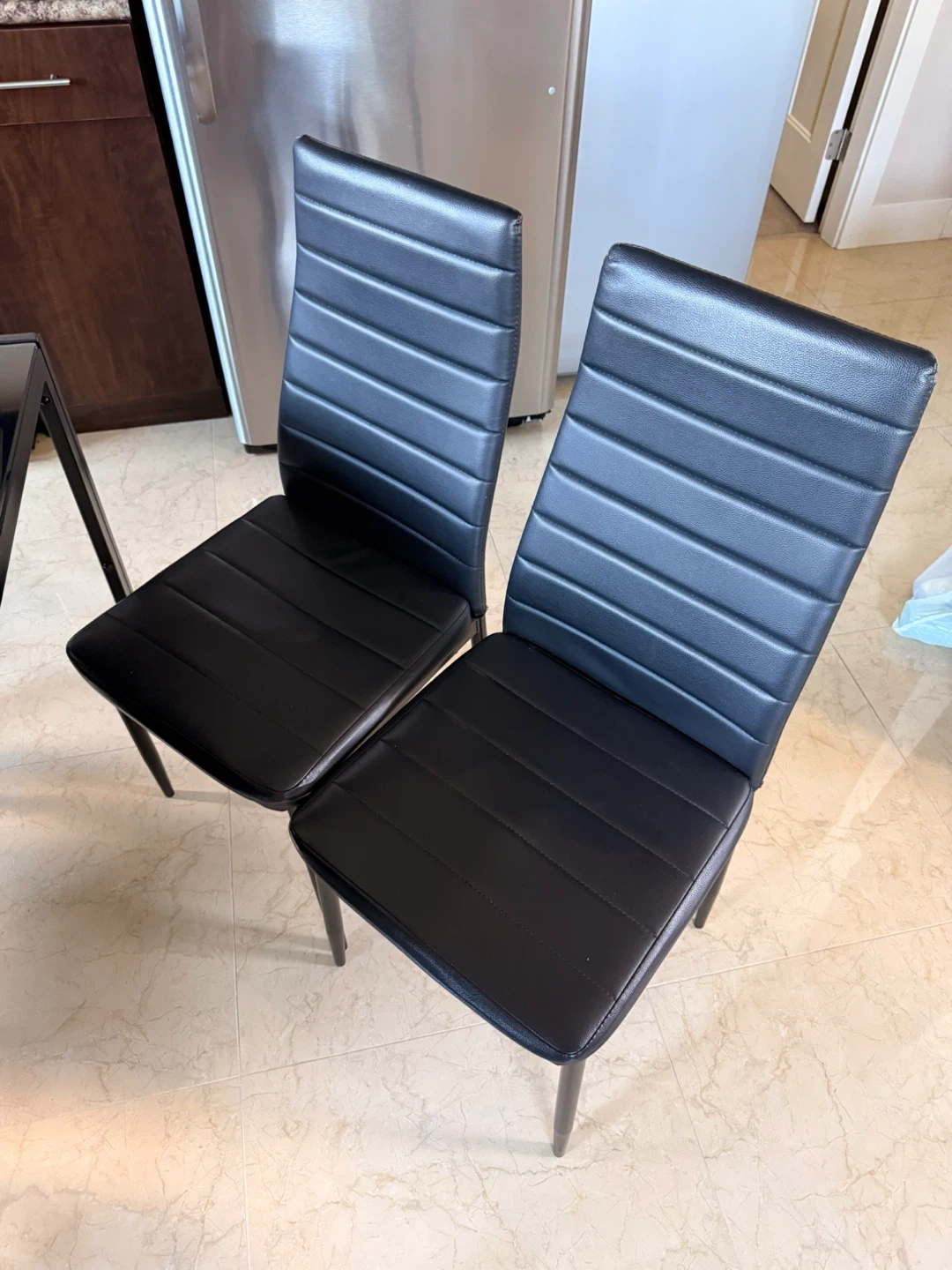 Four black dining chairs with a modern design. These chairs are upholstered in a faux leather material and feature a sleek, ribbed backrest. They're sturdy and comfortable, perfect for your dining area!