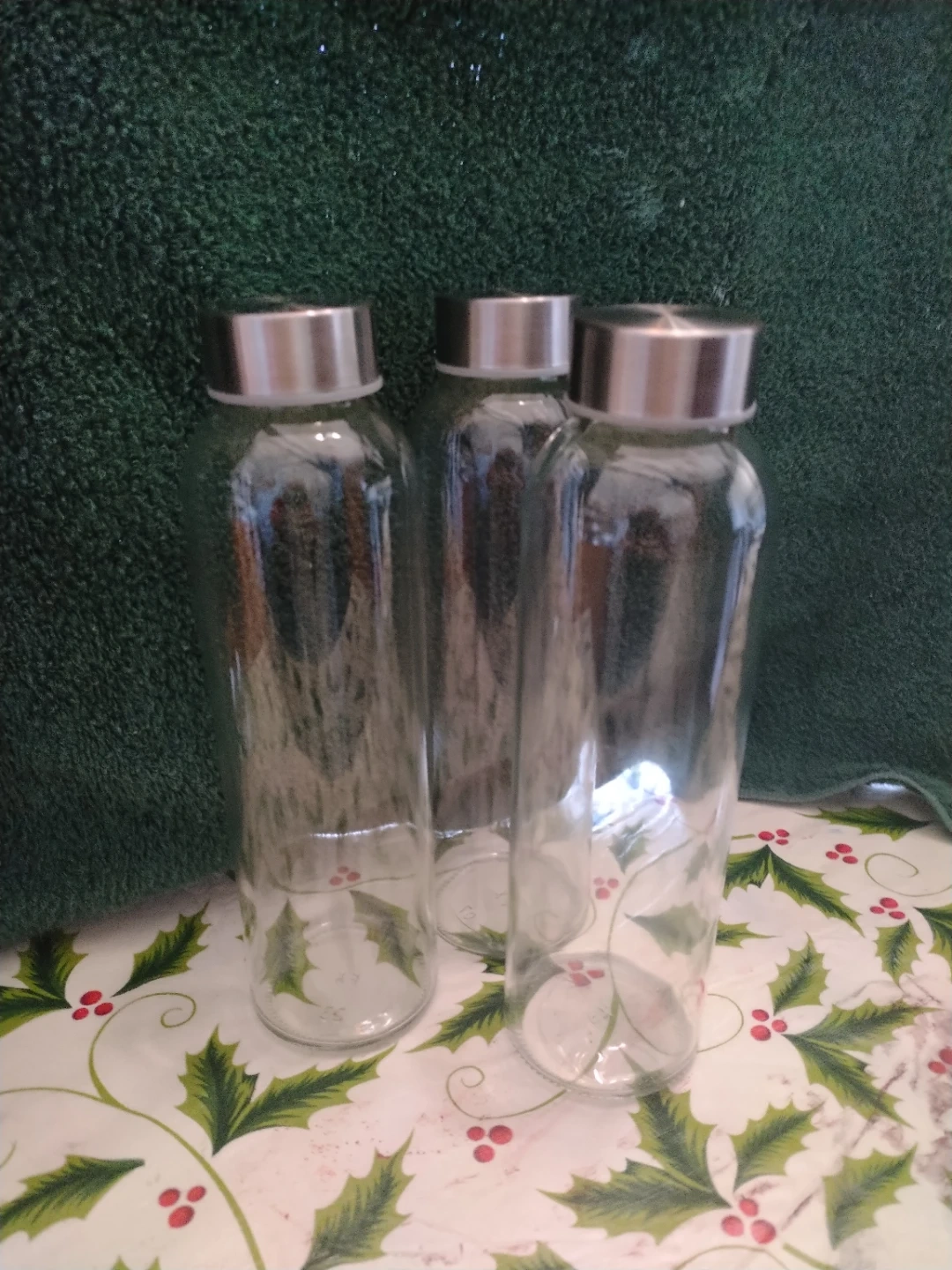 Three clear glass bottles with stainless steel screw-on lids. They're perfect for beverages or storage. Glass construction. Includes twelve bottles and bottle brush.