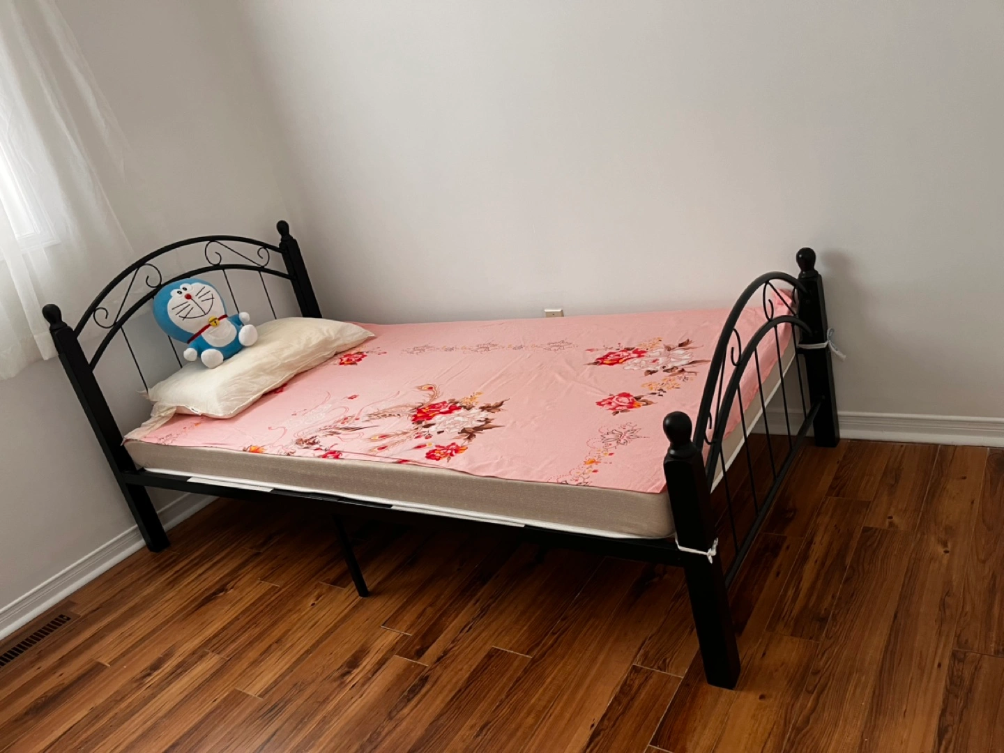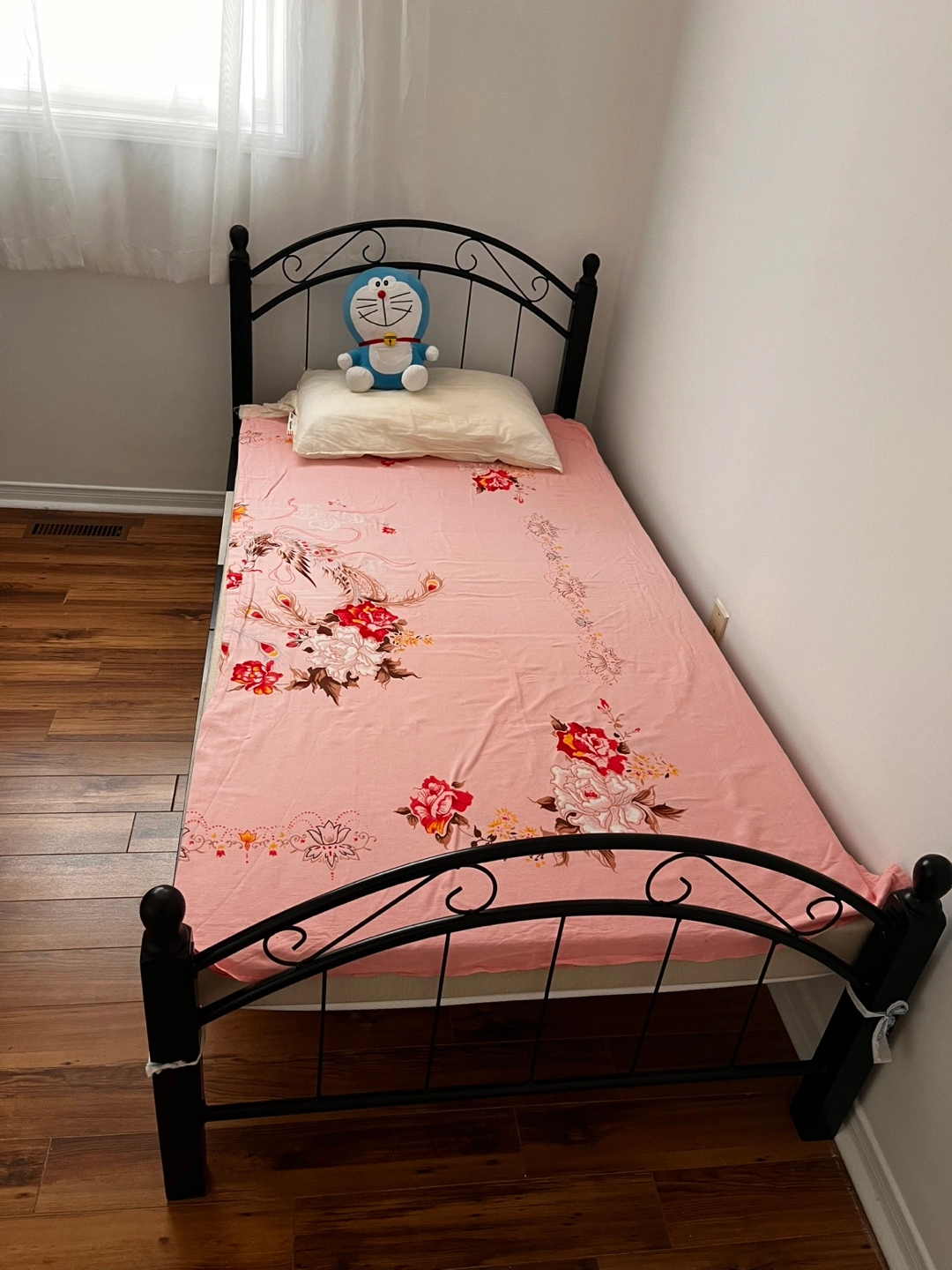 Black metal single bed frame. Simple design, sturdy construction. Perfect for a child's or guest room. Easy to assemble and disassemble.