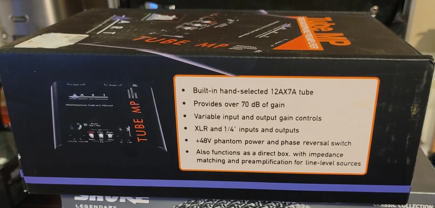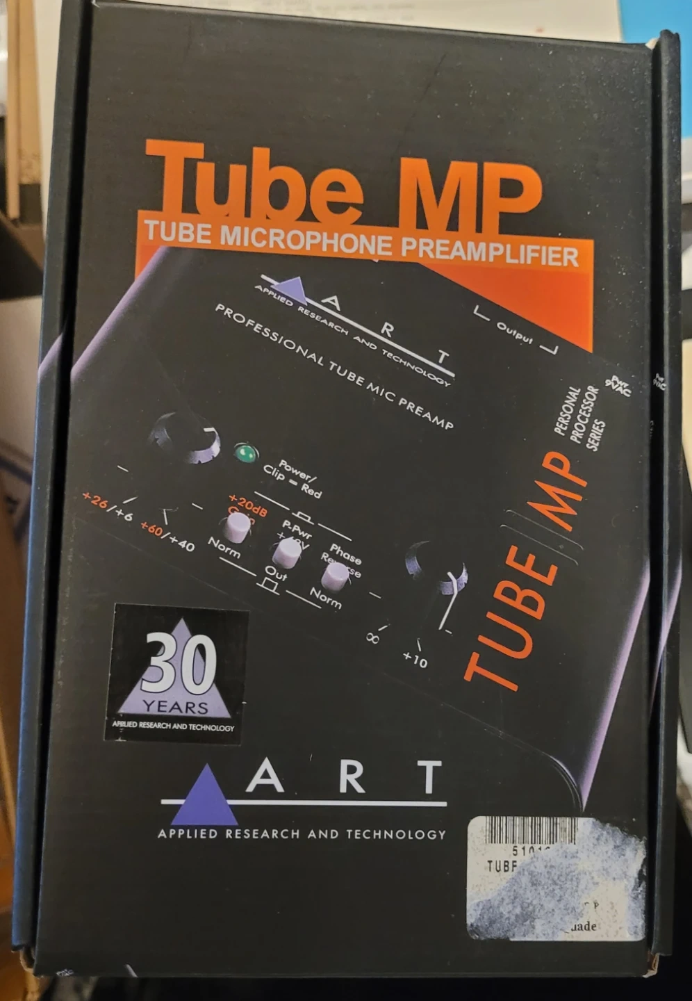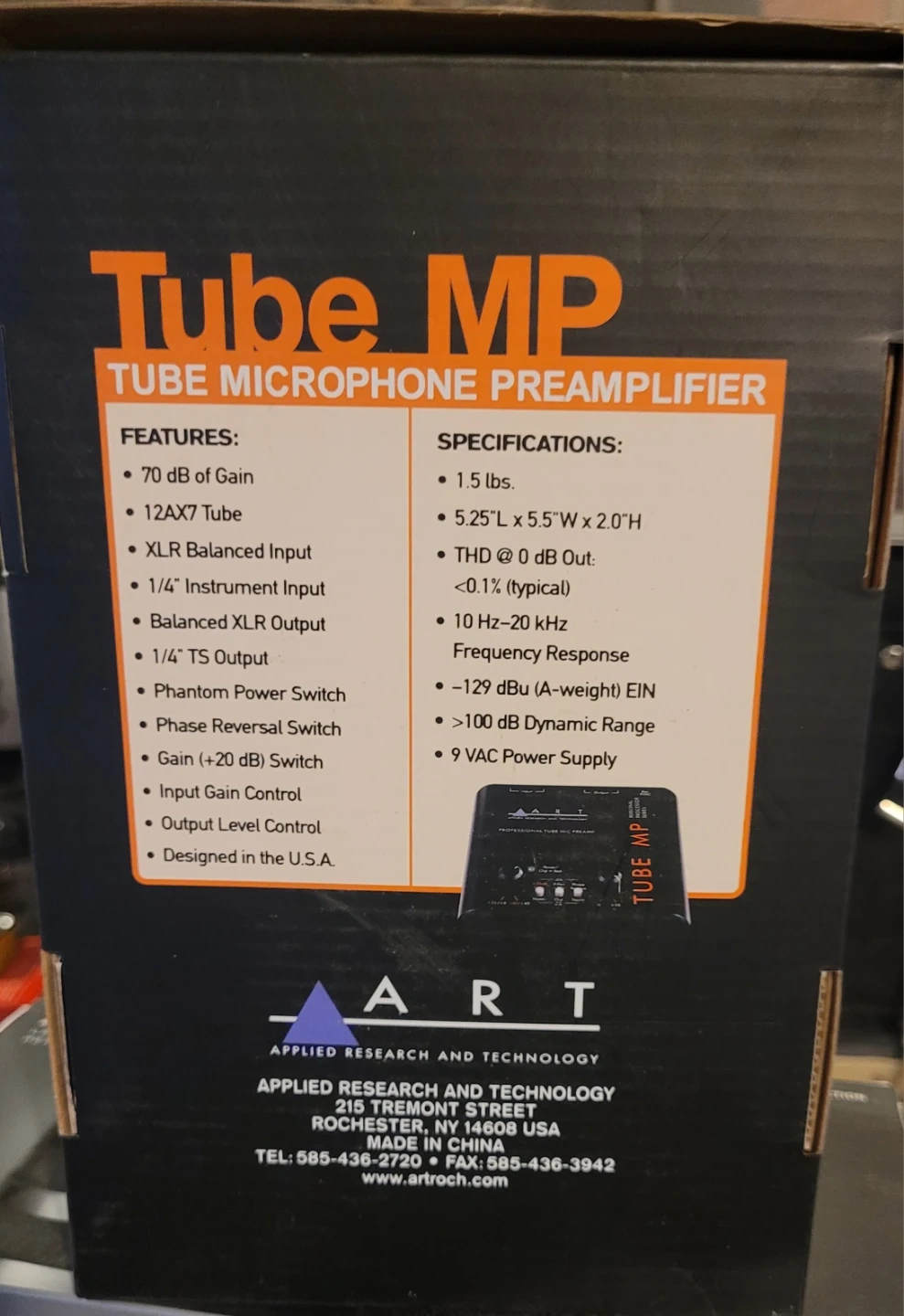This is the ART Tube MP professional tube microphone preamplifier. It offers adjustable gain levels and phantom power. This unit is great for enhancing vocal and instrument recordings.