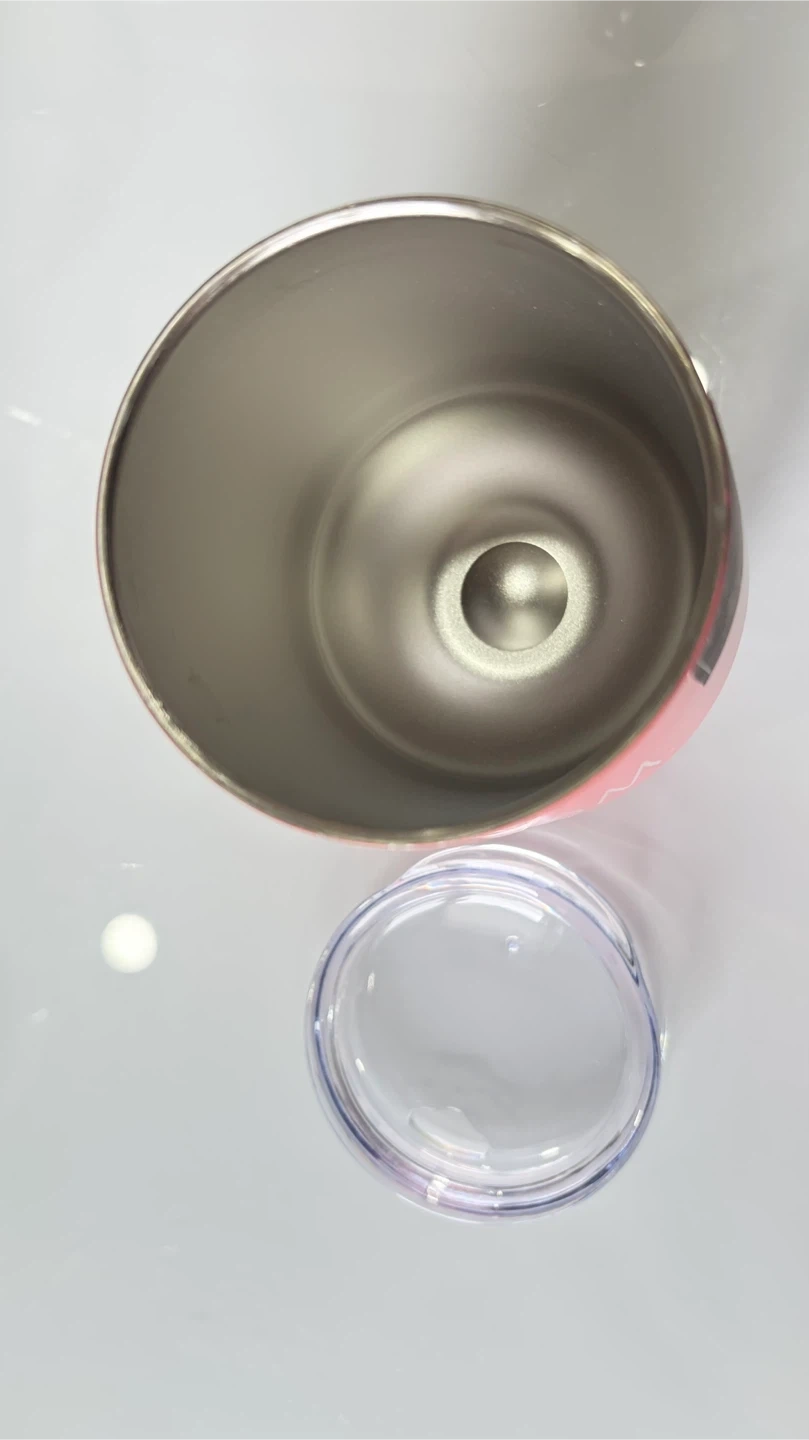 This Rae Dunn tumbler features the word "MOM" in white script. It's made of stainless steel and comes with a clear plastic lid. Great for keeping drinks hot or cold!