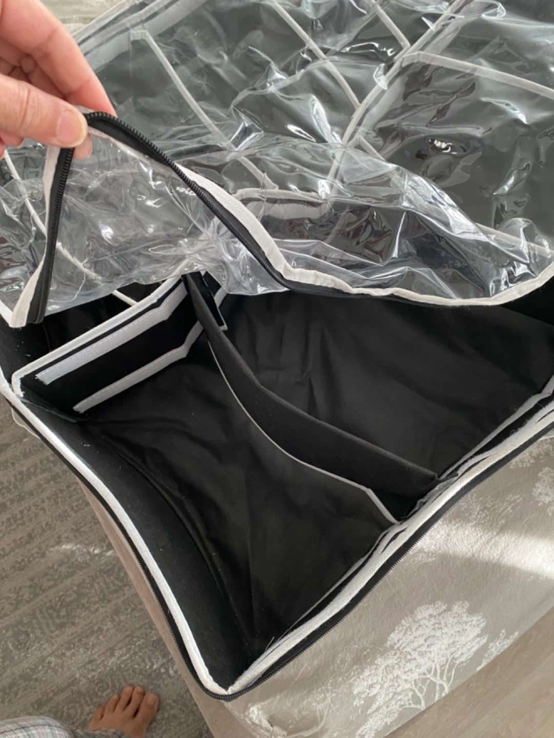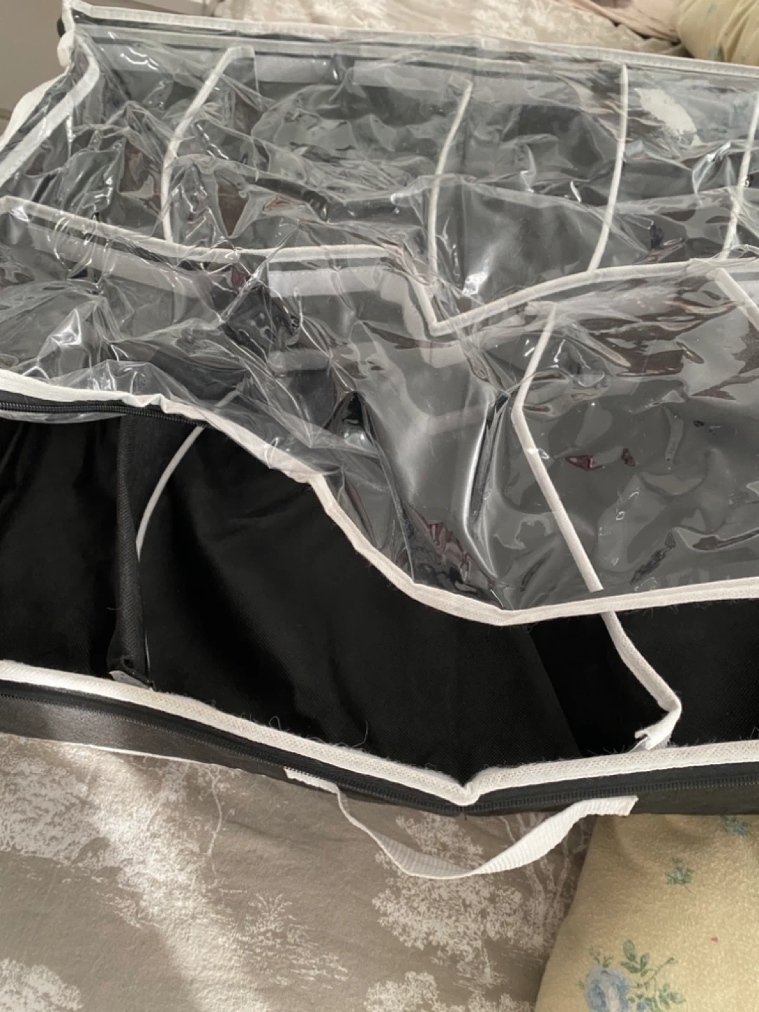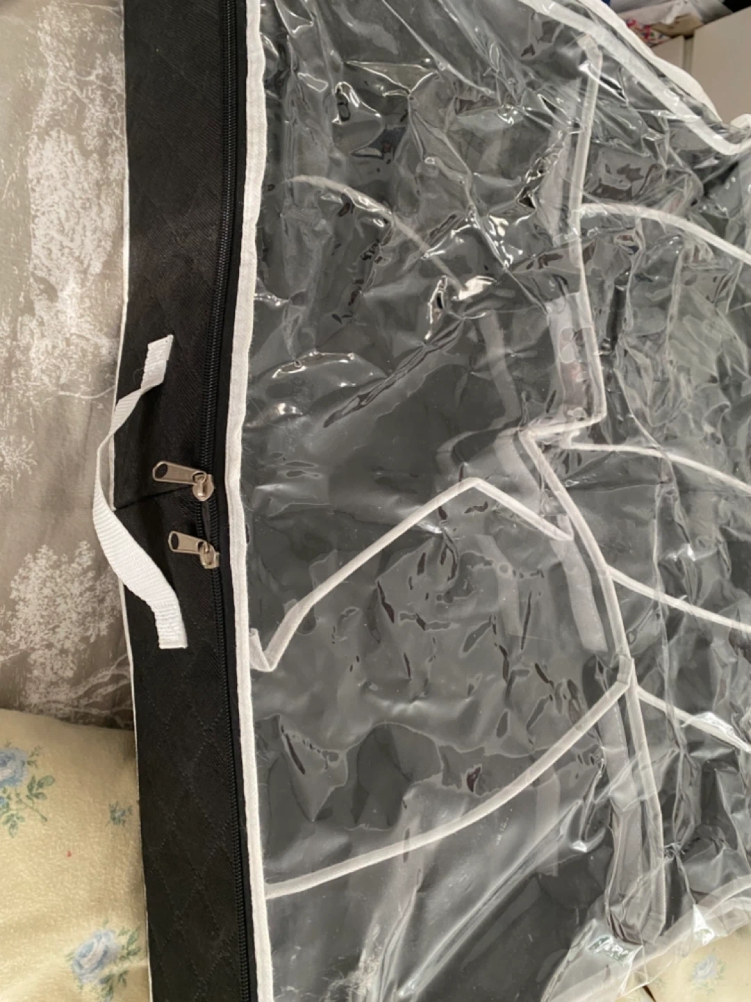 This hanging closet organizer features multiple clear pockets for easy visibility and access. It's made of durable fabric and has a zip-around closure for protection. It's perfect for storing shoes, accessories, or other small items.