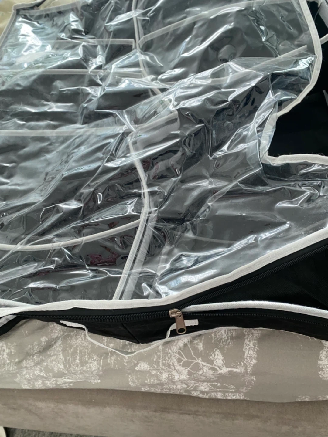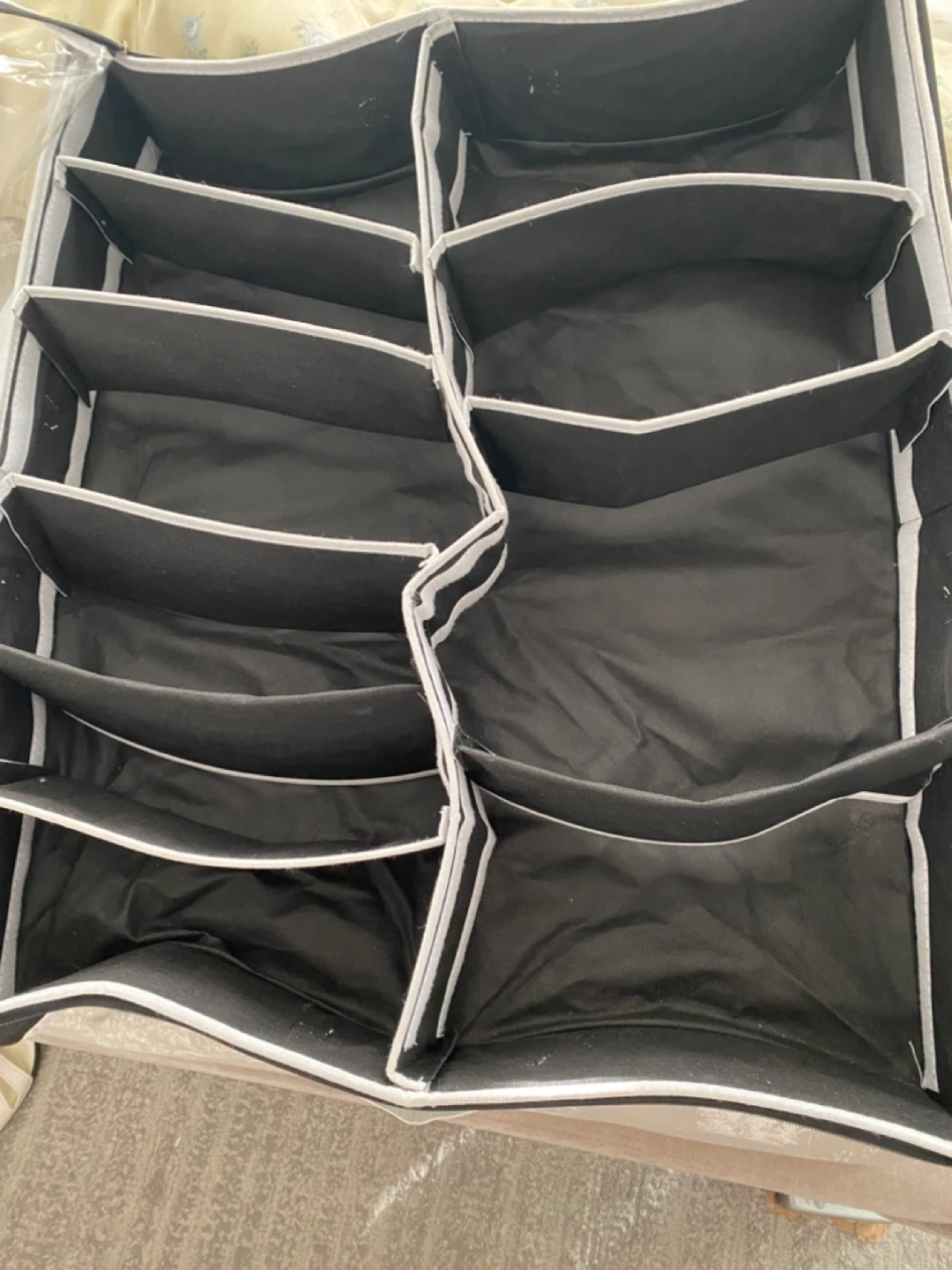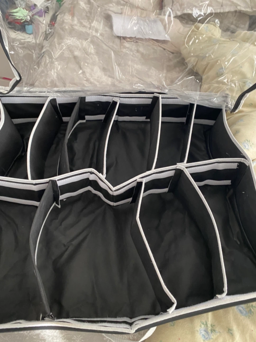 This hanging closet organizer features multiple clear pockets for easy visibility and access. It's made of durable fabric and has a zip-around closure for protection. It's perfect for storing shoes, accessories, or other small items.