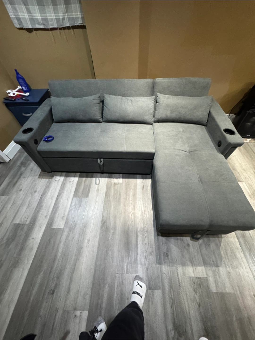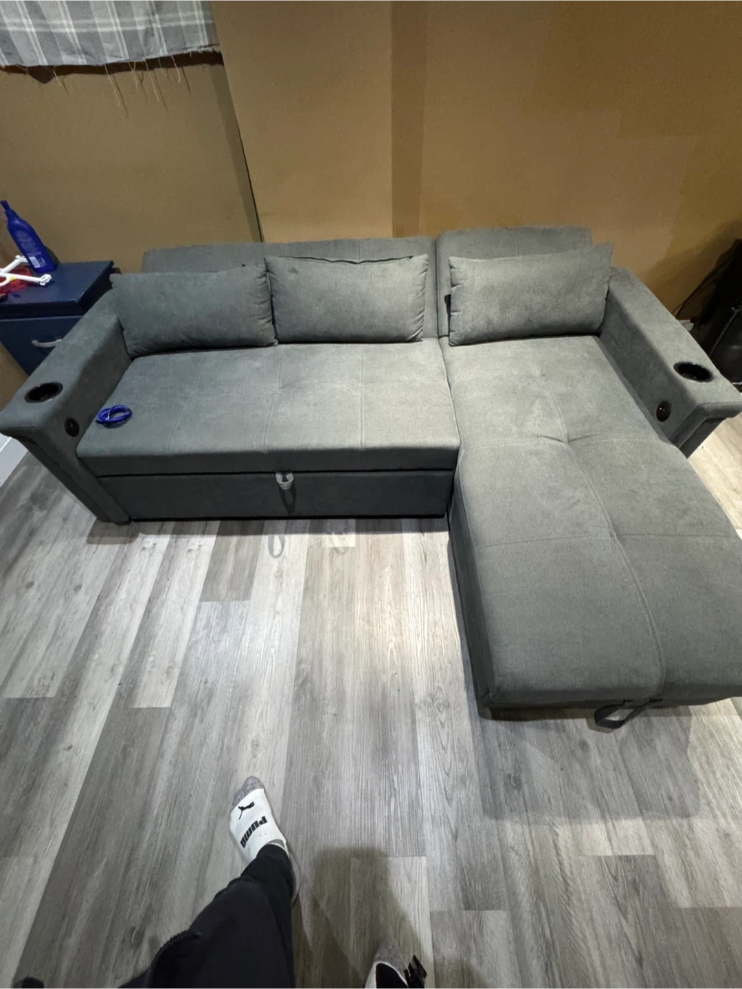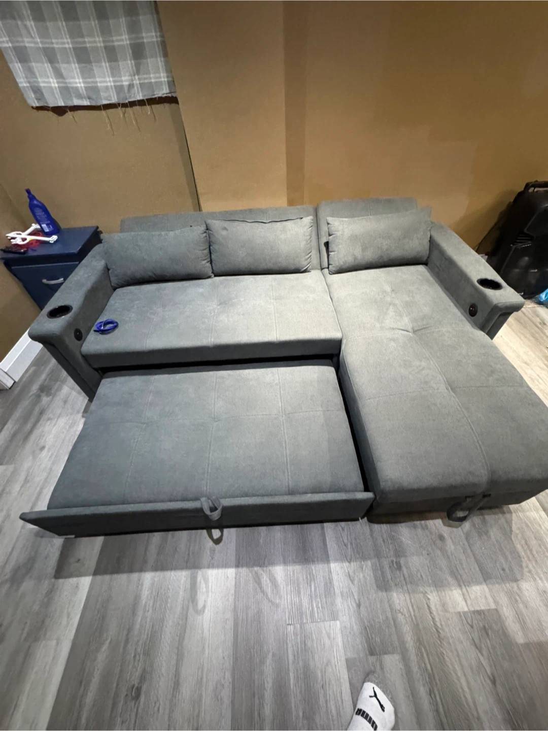This grey sectional sofa offers convenient pull-out bed functionality and built-in USB charging ports. It's upholstered in a durable fabric and features cup holders on the arms. Storage is available under the chaise. Pick up only