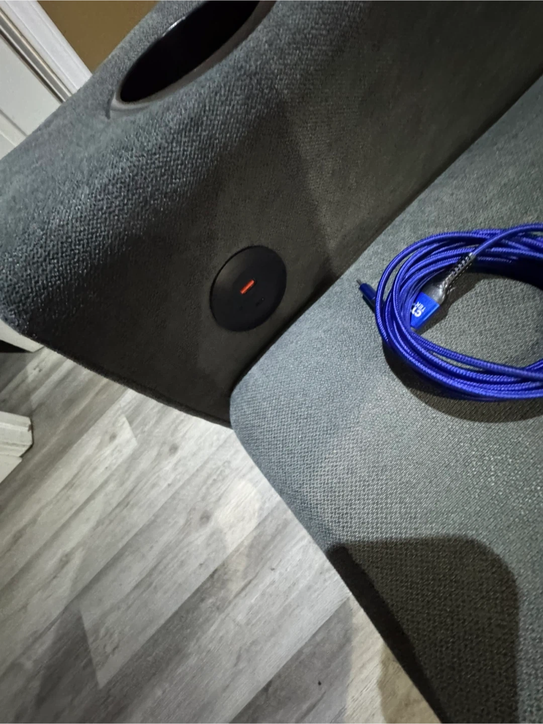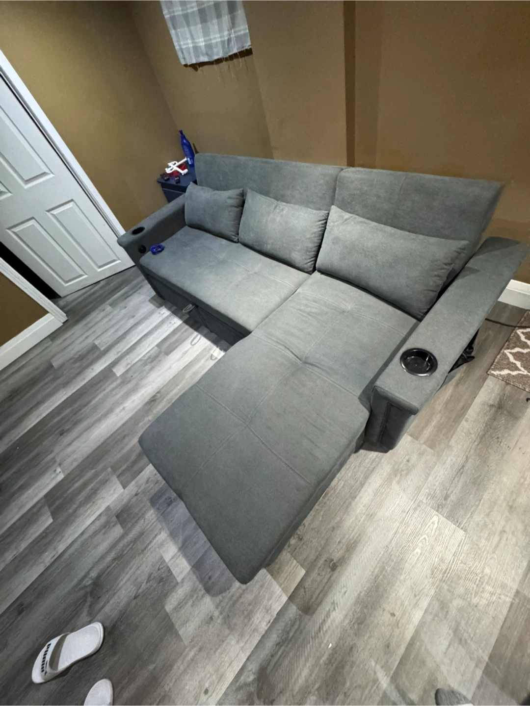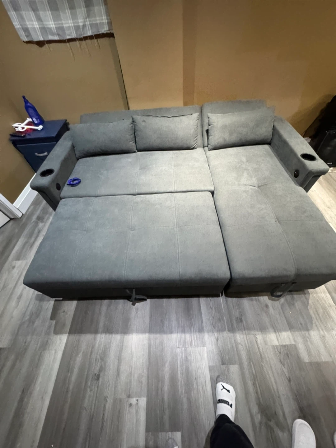 This grey sectional sofa offers convenient pull-out bed functionality and built-in USB charging ports. It's upholstered in a durable fabric and features cup holders on the arms. Storage is available under the chaise. Pick up only