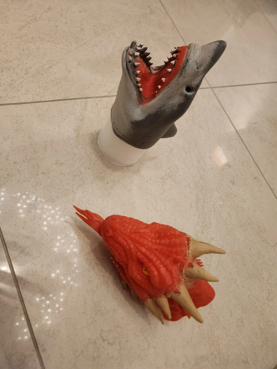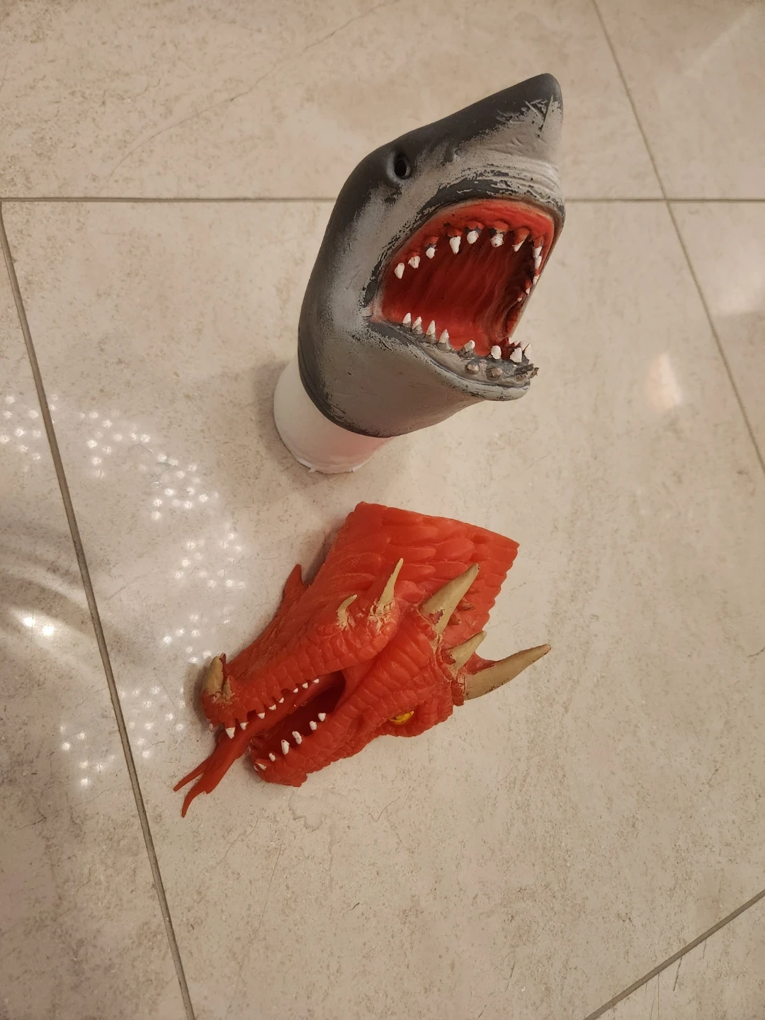 Two fun hand puppets, one a grey shark and the other a red dragon. They're great for imaginative play and storytelling! Easy to slip on for hours of entertainment.