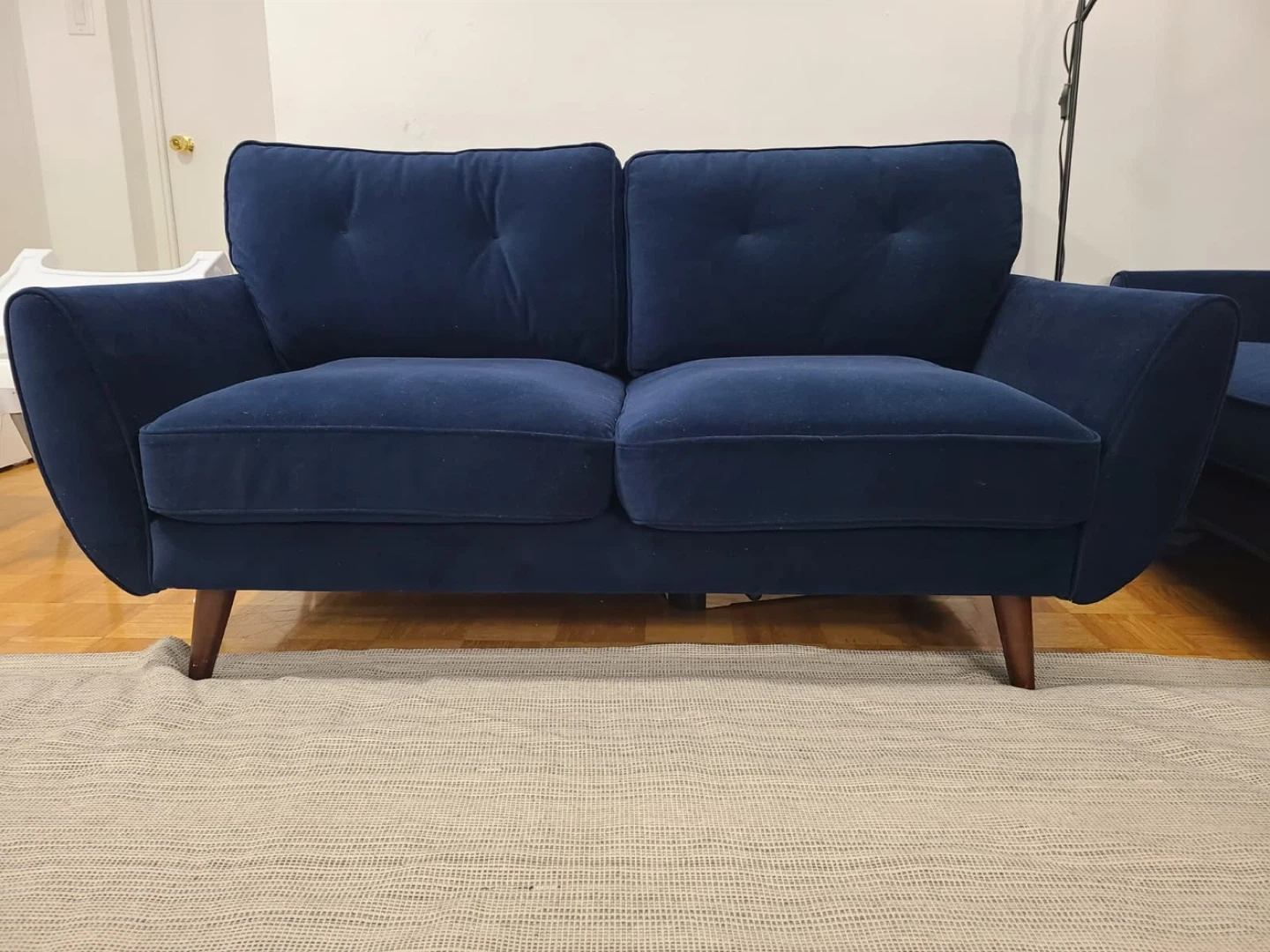 A comfy navy blue two-seater sofa. Its velvet upholstery offers a soft feel. Features button tufting on the back cushions and tapered wooden legs. Bought from Leons’ an year ago. In really good condition. Same 4 cushions are also available