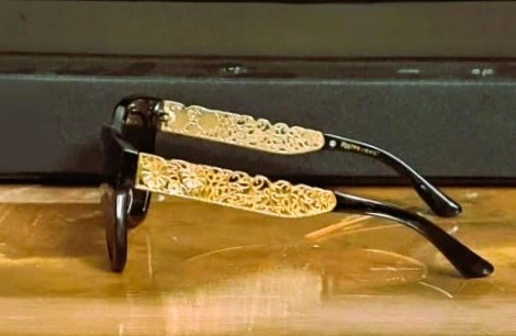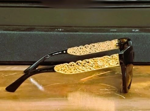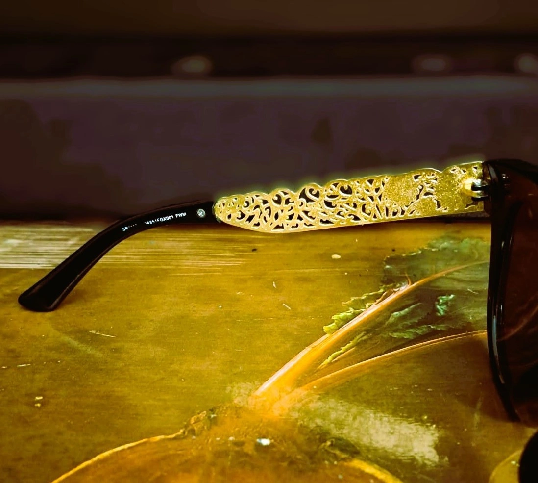 Features: Lightweight for all-day comfort, impact-resistant lenses, and intricate laser-cut gold metalwork.