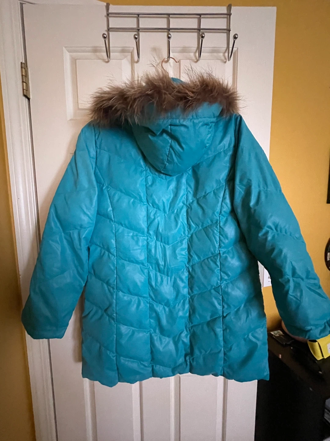 Looking to sell this teal puffer coat. It's in great condition and ready to keep you warm this winter! The coat features a faux fur trim on the hood and a quilted design.