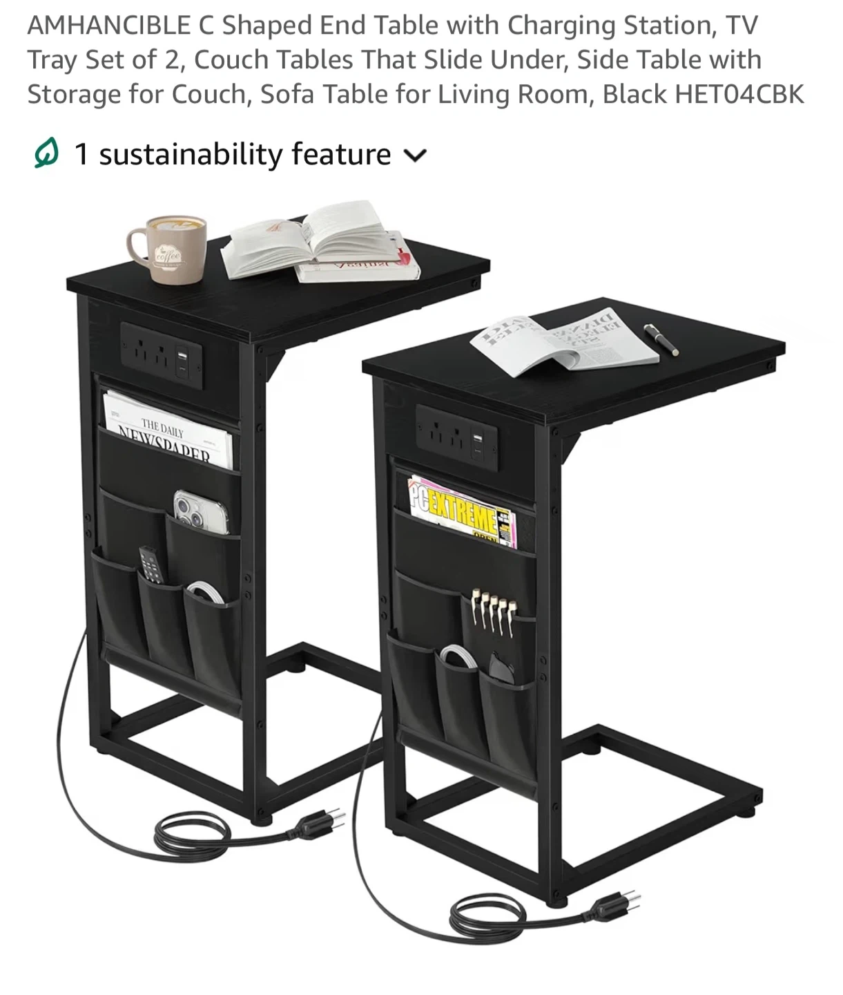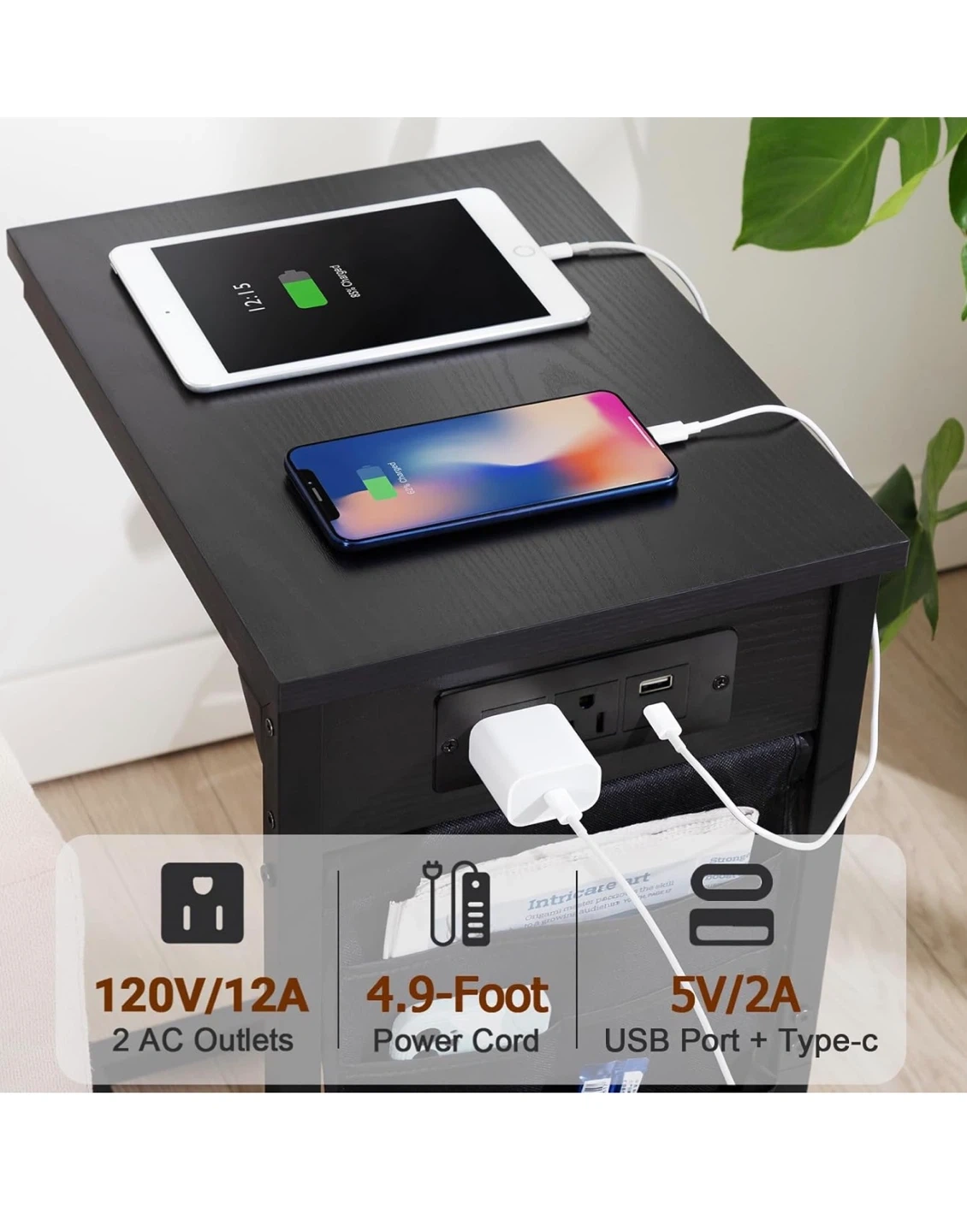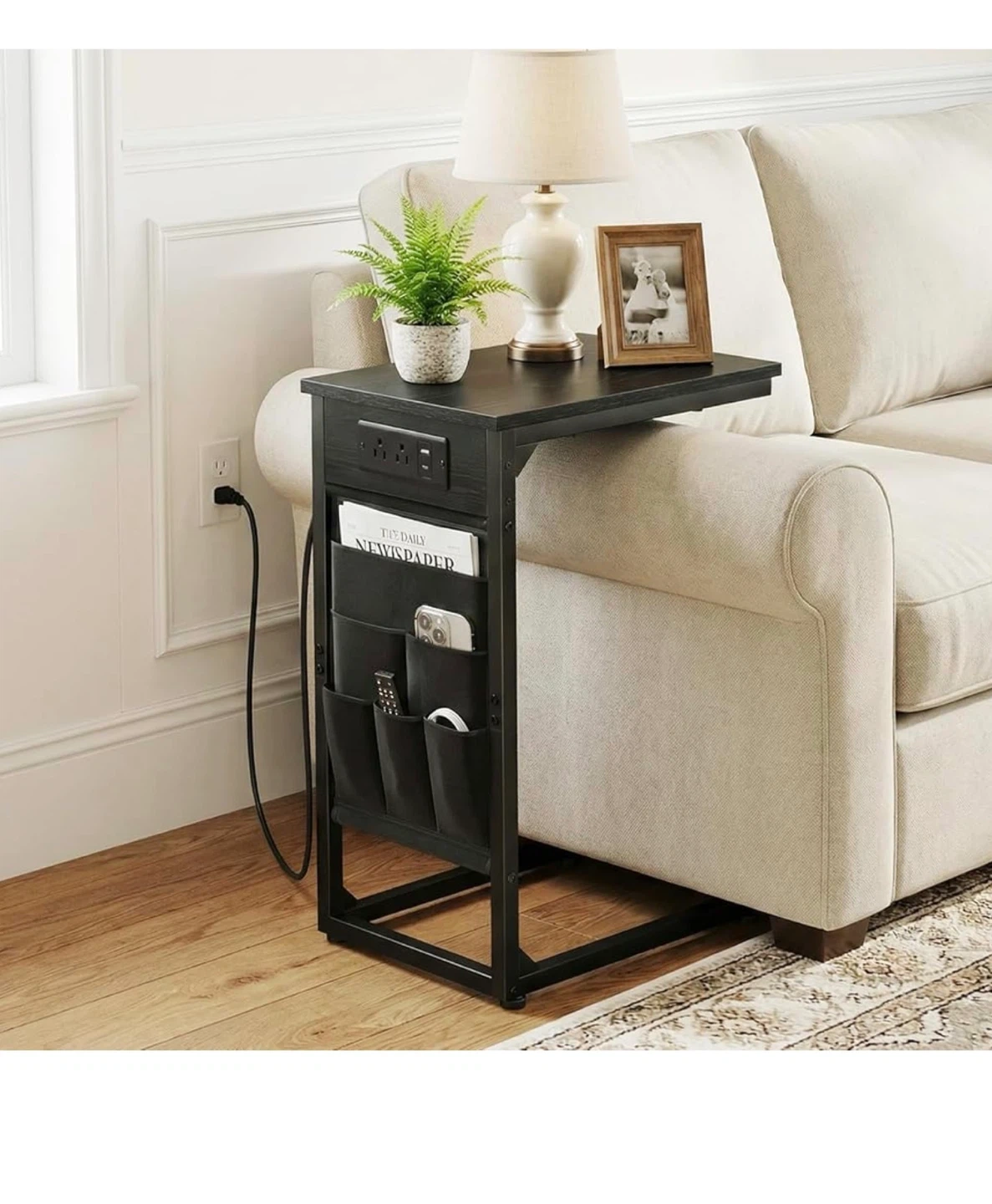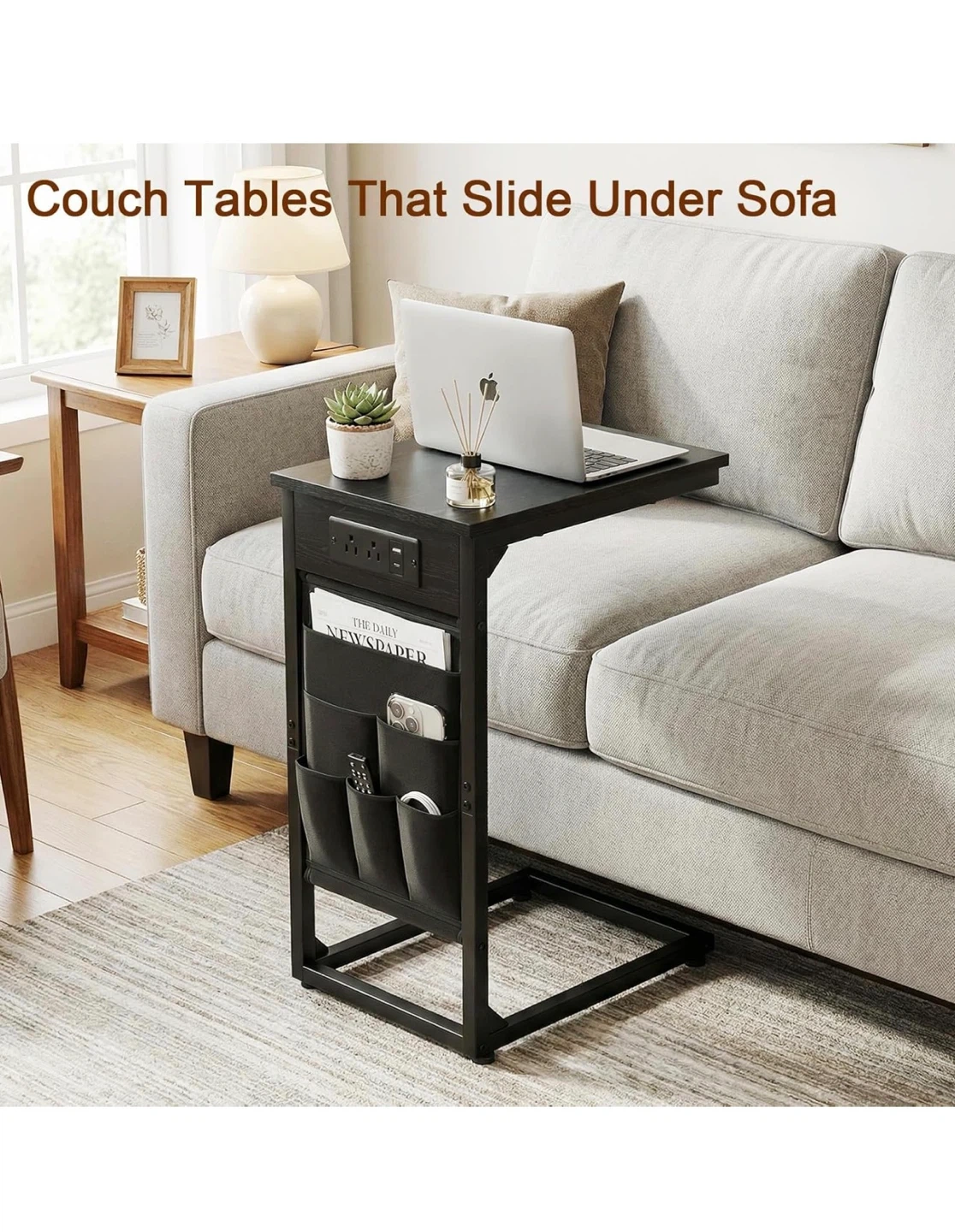This C-shaped end table features two AC outlets and one USB port for charging devices. It's made with a black wood-grain finish and includes side storage pockets for magazines or remotes. The table's base slides under your couch for easy placement. It's perfect for keeping your essentials close by while you relax!