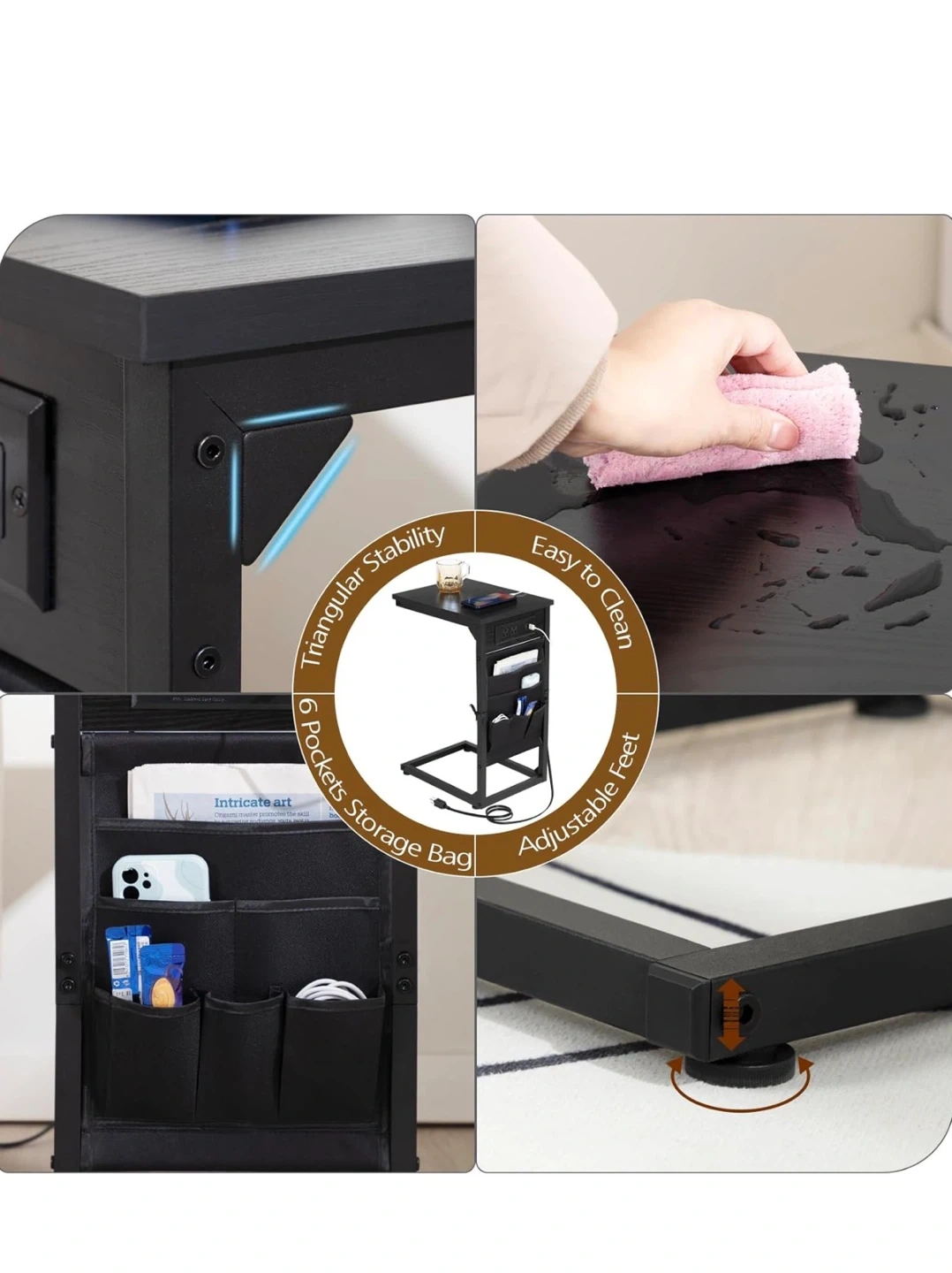 Black C-Shaped End Table wCharging Station and Storage Pockets