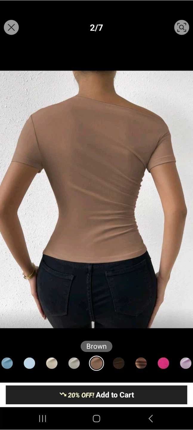 This stylish brown top features a flattering one-shoulder design with elegant ruching. It's made from a soft, stretchy fabric for all-day comfort. Perfect for dressing up or down!
