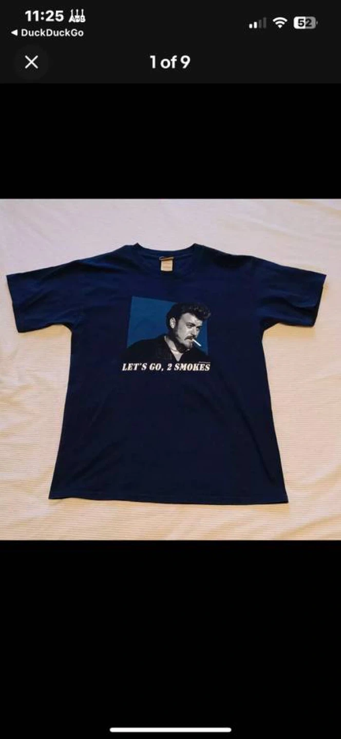 Selling a Trailer Park Boys t-shirt featuring Ricky. The shirt is navy blue and says "Let's go, 2 smokes" underneath the image of Ricky.