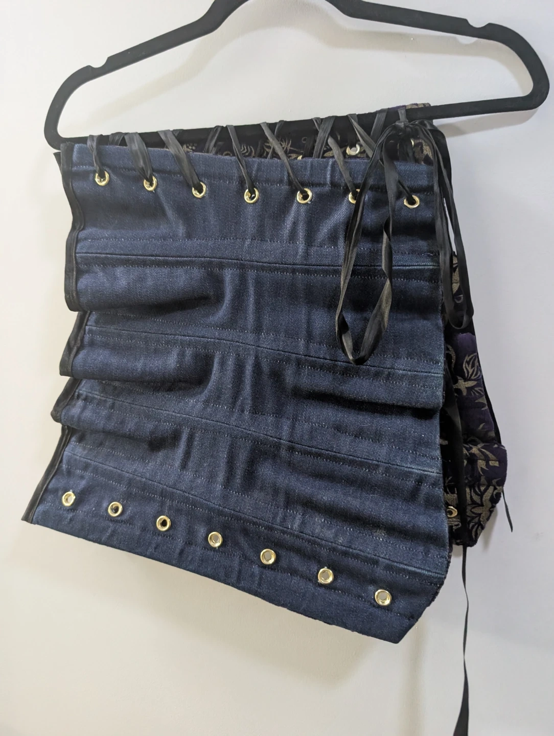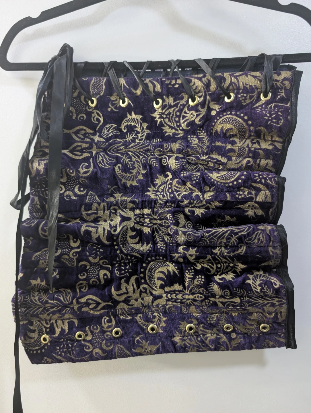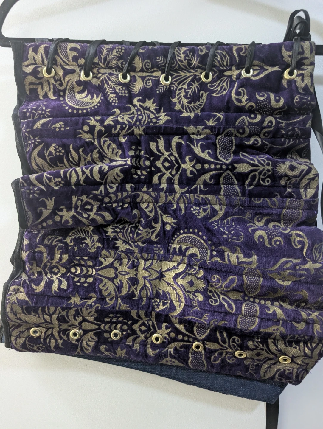 This corset is reversible - a purple velvet with an intricate gold damask pattern on one side and a dark denim front with gold grommets and black lacing. It's designed for a snug fit and stylish look
