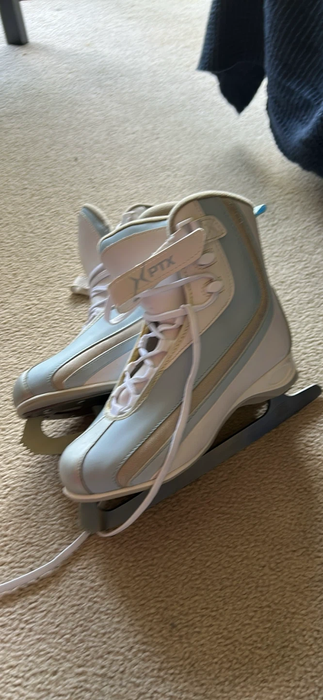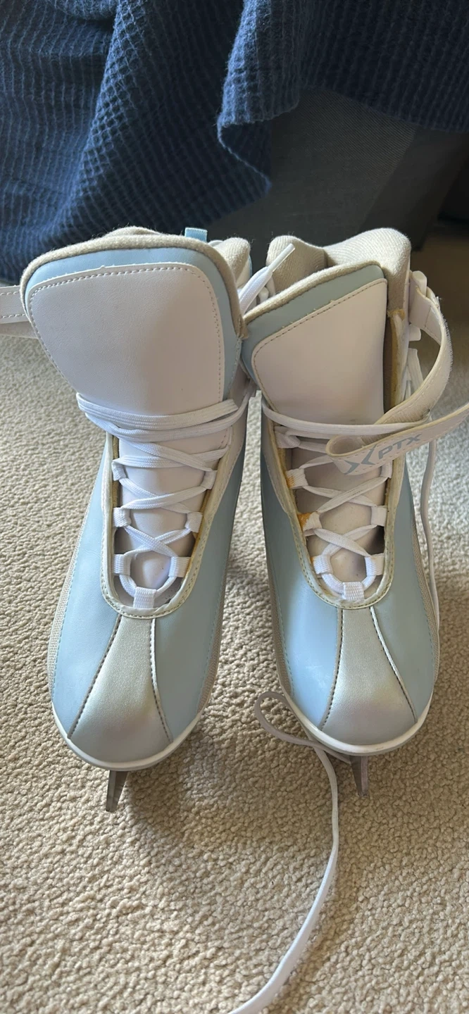 Ice skates in a light blue and white colourway. Features adjustable ankle strap for support. Blade guards are included. Size 7.