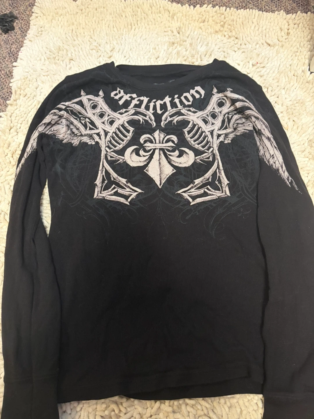 Selling a black long sleeve shirt from Affliction. It features a detailed graphic design on the front. Great for casual wear!