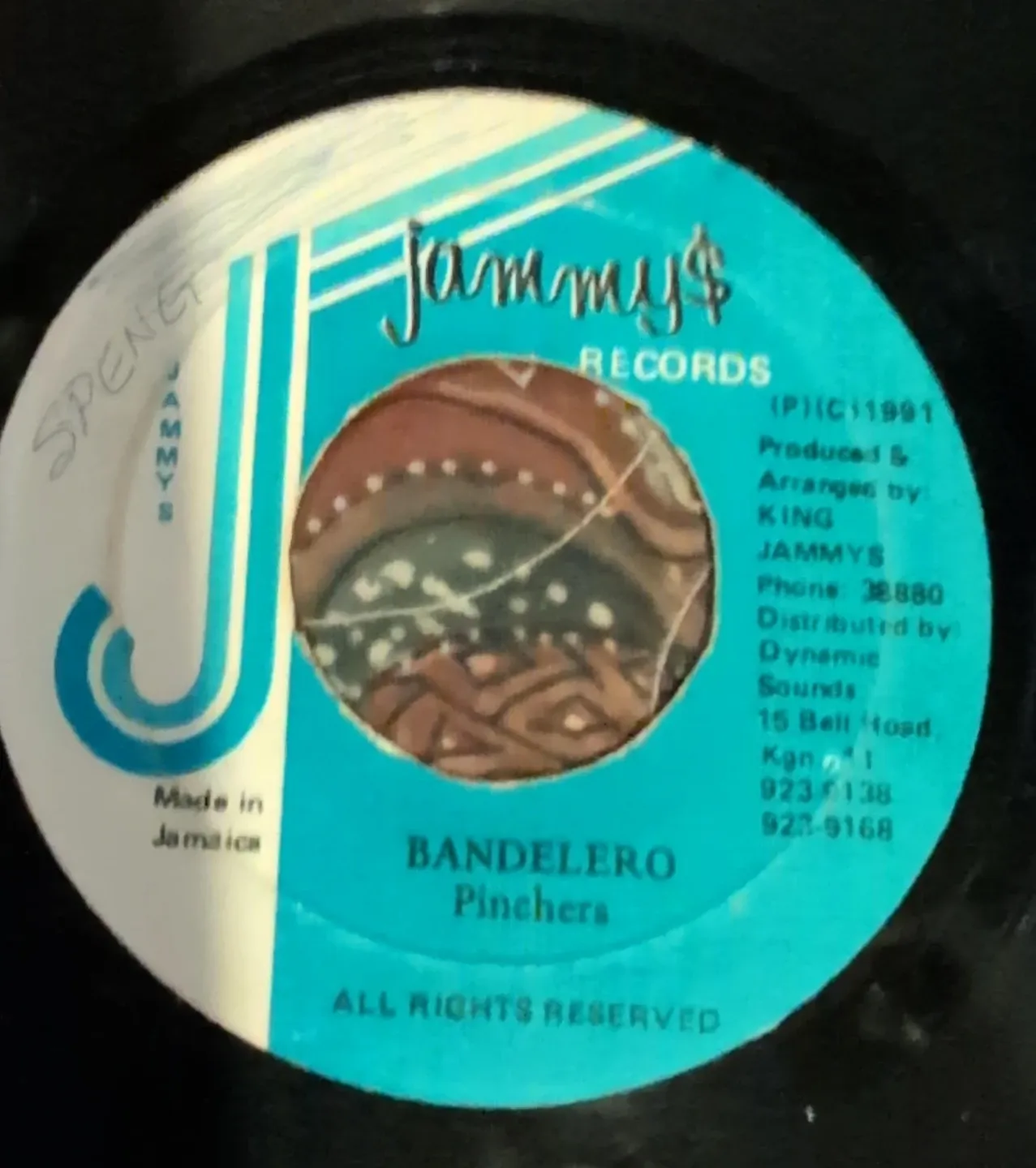 Jammy$ Records 7-inch vinyl single featuring "Bandelero" by Pinchers. Produced & Arranged by KING, it was released in 1991 and is made in Jamaica. The vinyl is distributed by Dynamic Sounds.