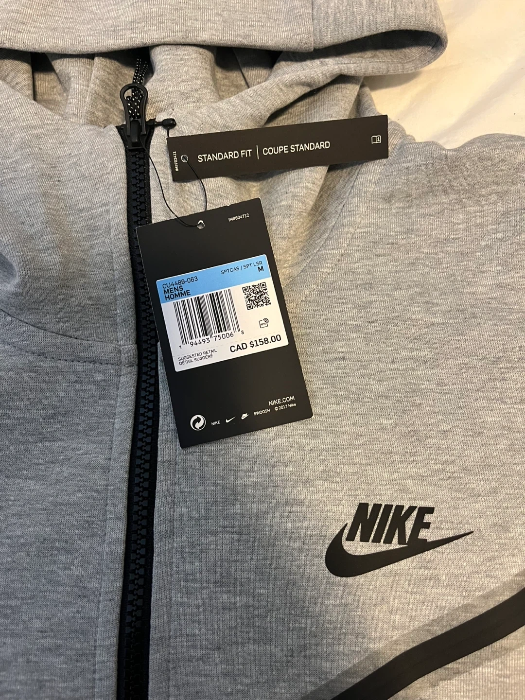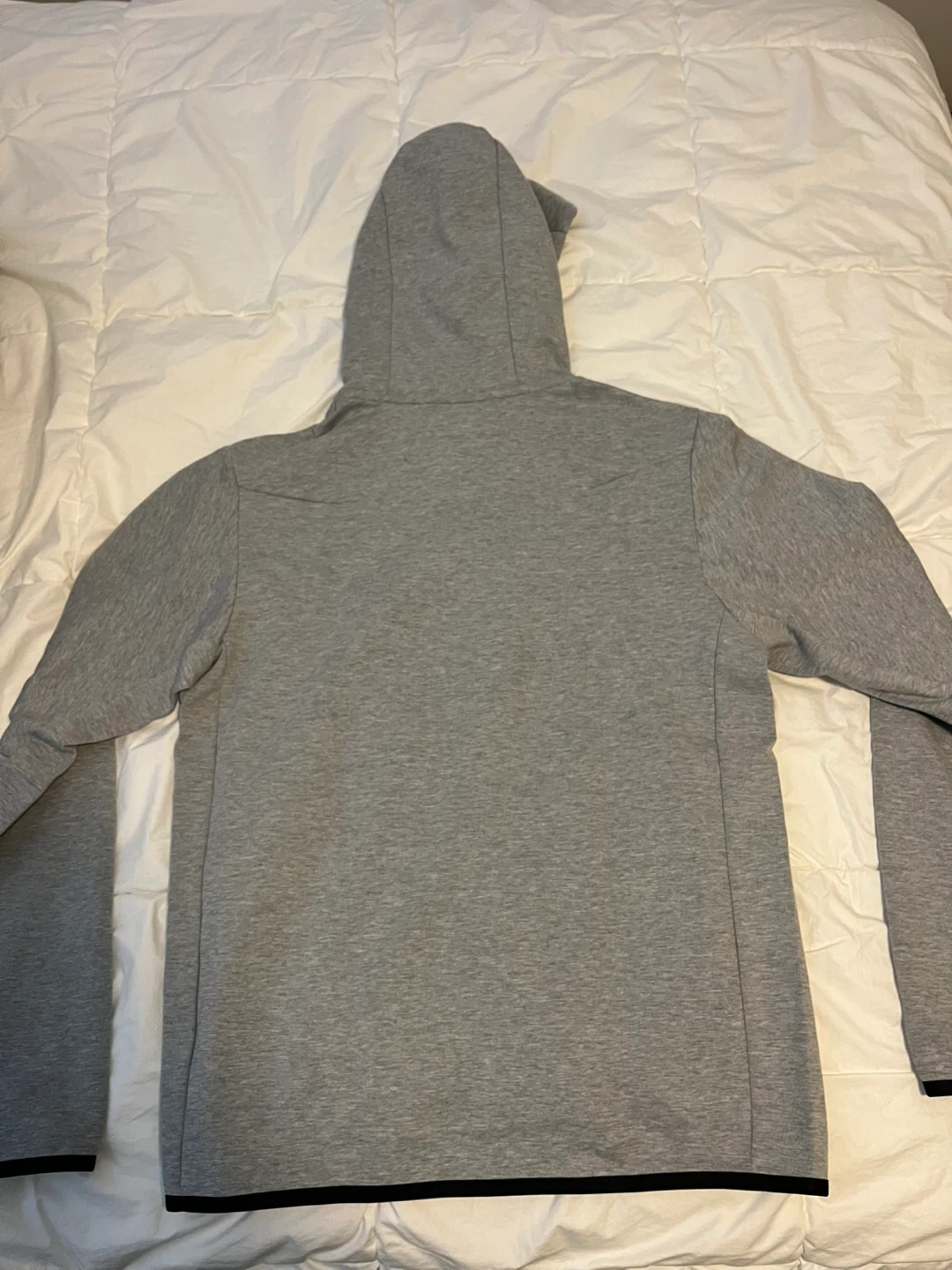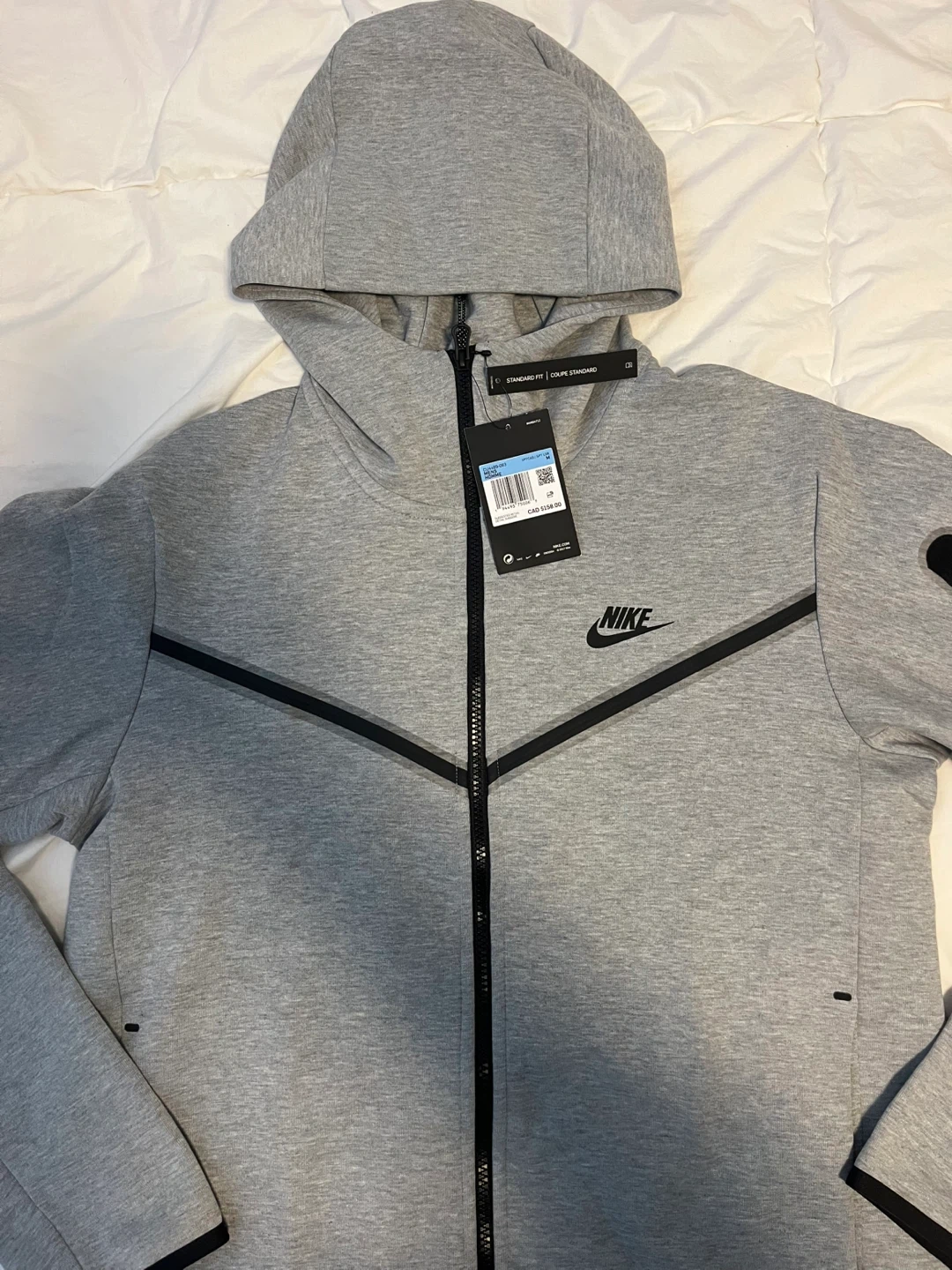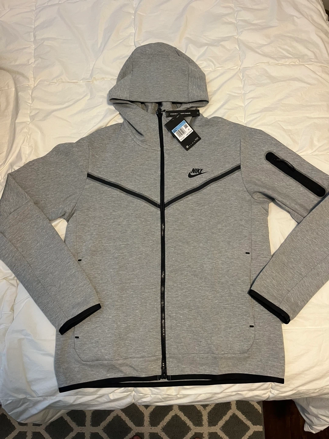 Grey Nike Tech Fleece full zip hoodie. It's a size medium with standard fit. This hoodie has a full zip closure and pockets. Comes with original tags attached.