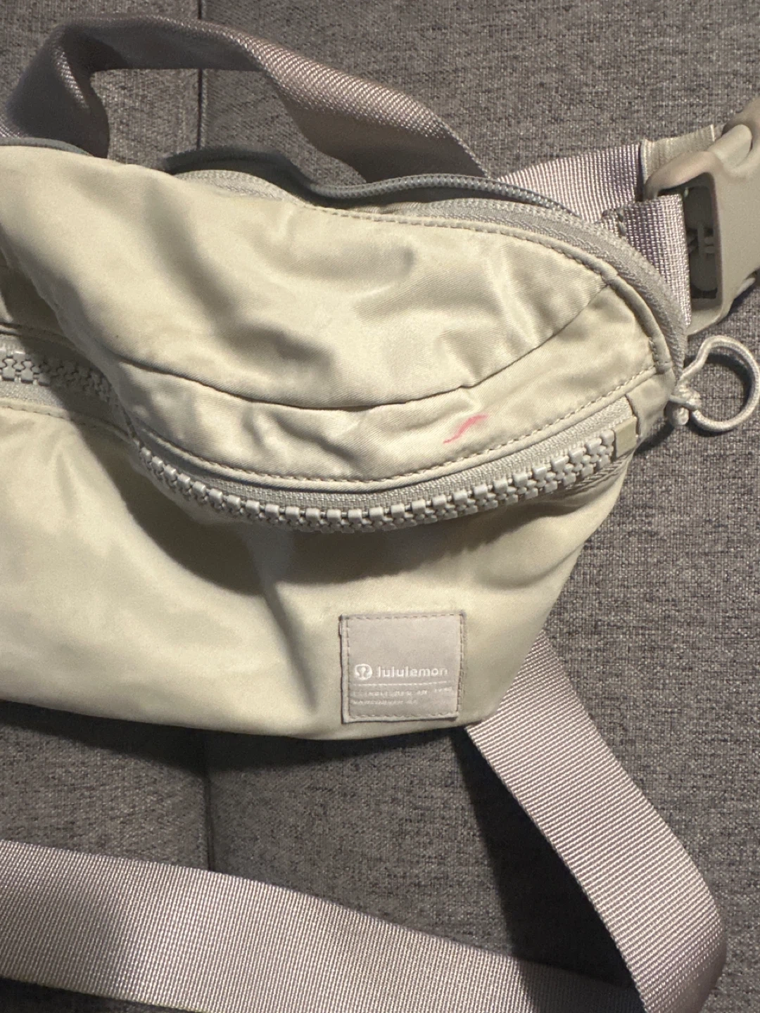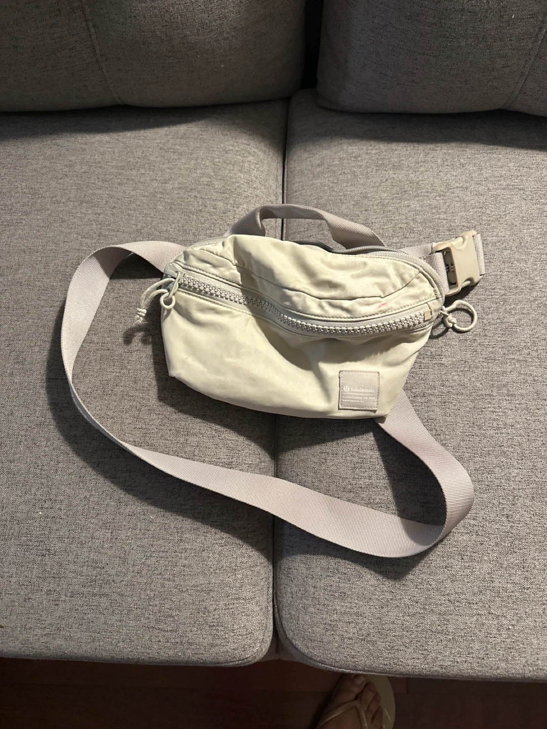This is a Lululemon belt bag in a light beige colour. It has multiple zippered compartments and an adjustable strap. It's made of durable material and is great for carrying essentials on the go!