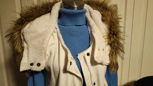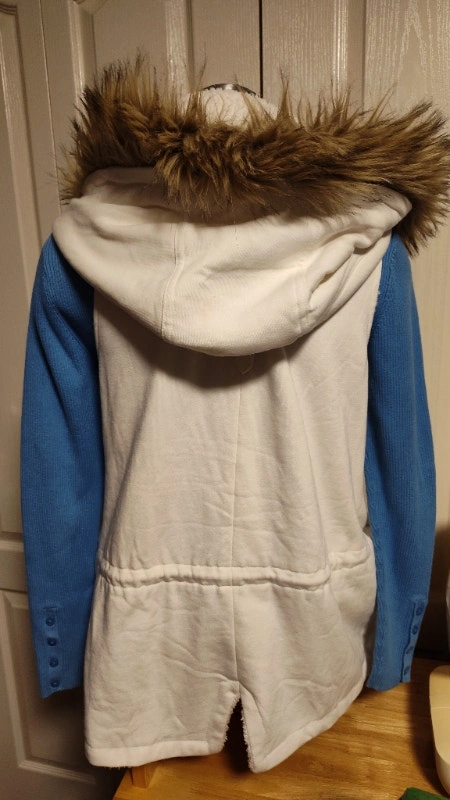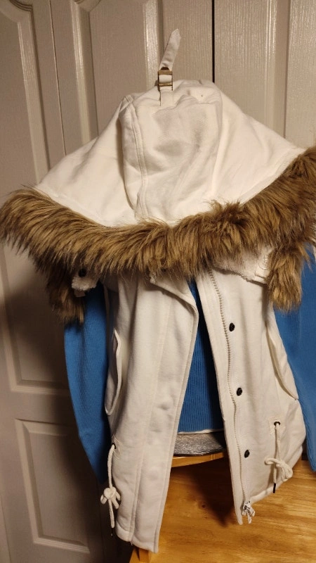 Never worn, this white vest has a removable hood and faux fur trim to customize style. It has a zipper closure, a waist drawstring, and pockets. Size medium. It has a warm faux sheepskin liner. I also have the same one in black in another ad. Asking $25 each, or best offer. Pick up in Mississauga near Britannia Rd and Ninth Line.