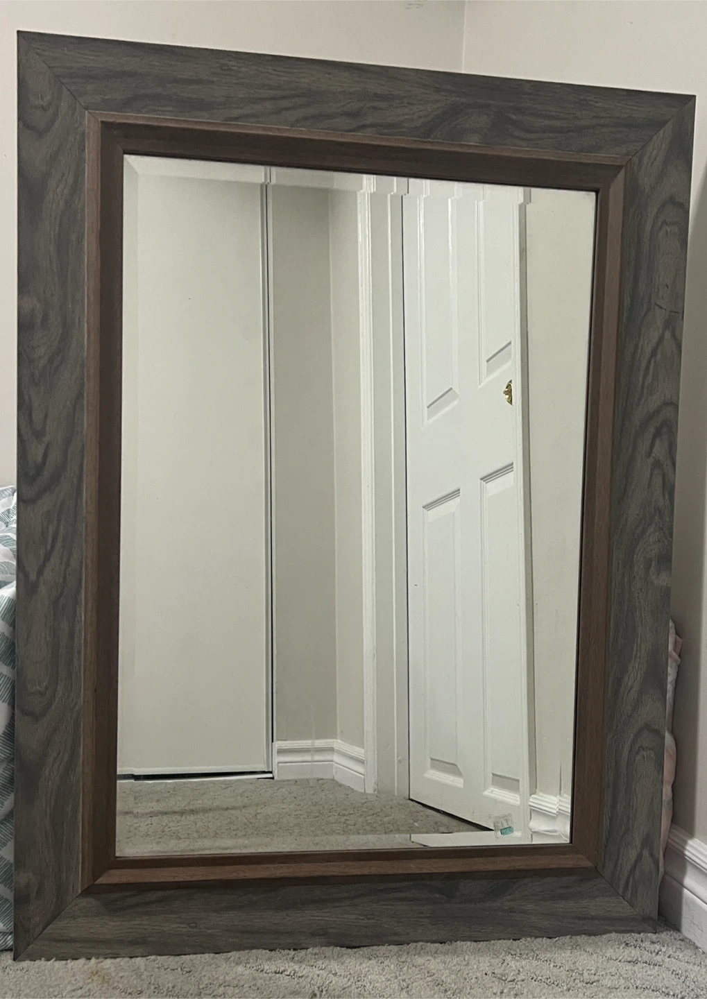 This is a wood-framed mirror. The frame has a gray wash wood grain finish with a darker brown inner border. It's a nice addition to any room!
