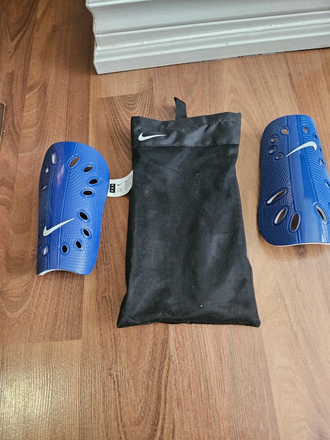 These are blue Nike shin guards. They come with a black carrying pouch. They're designed with multiple ventilation holes for breathability. Size Medium KIDS
