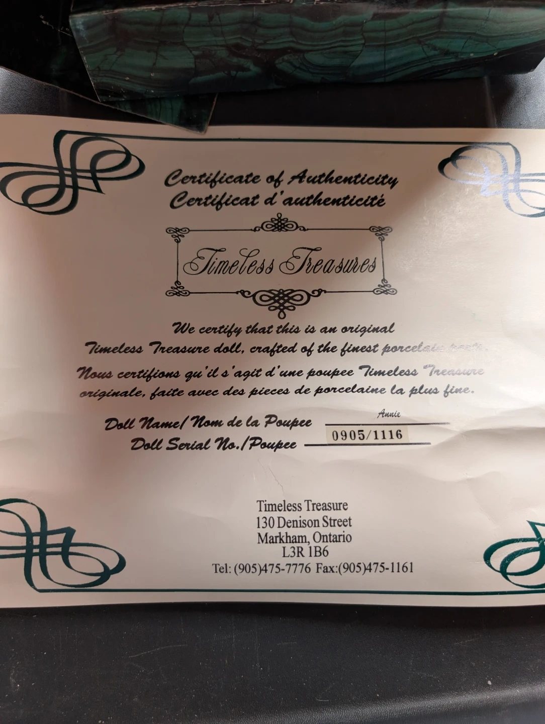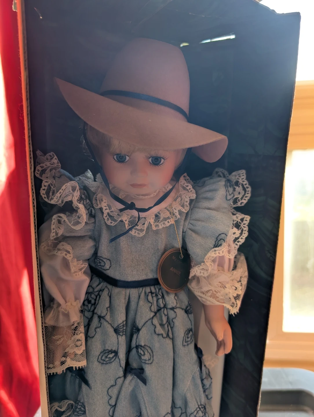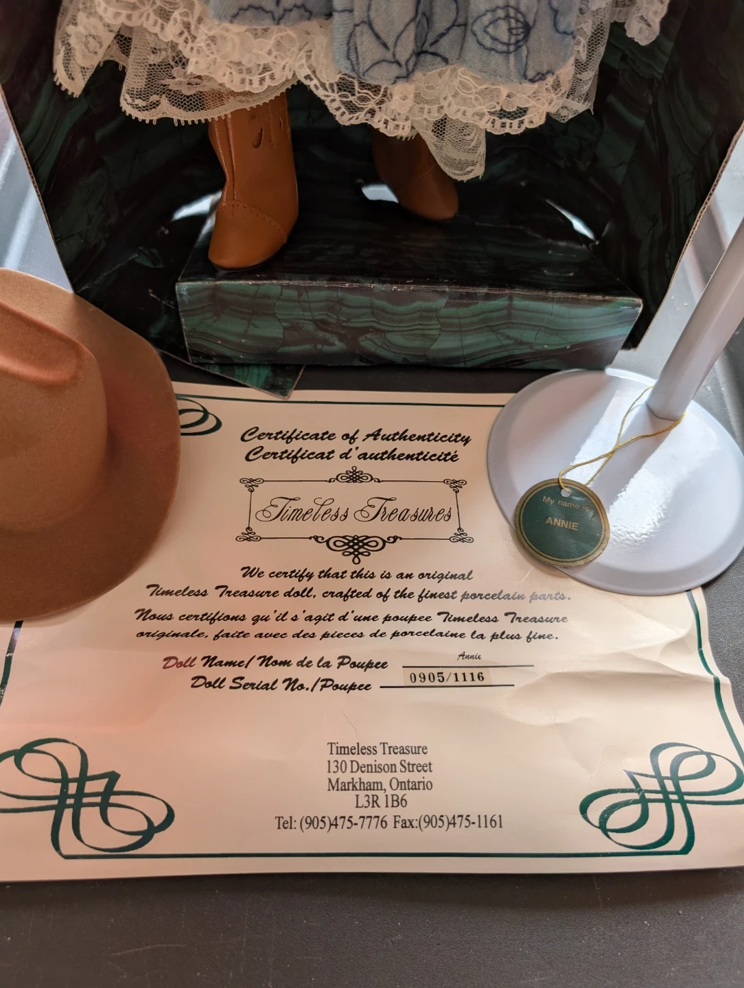 This is the Annie doll from Timeless Treasures. It's crafted from fine porcelain parts. The doll wears a blue dress and comes with a cowboy hat and boots.
