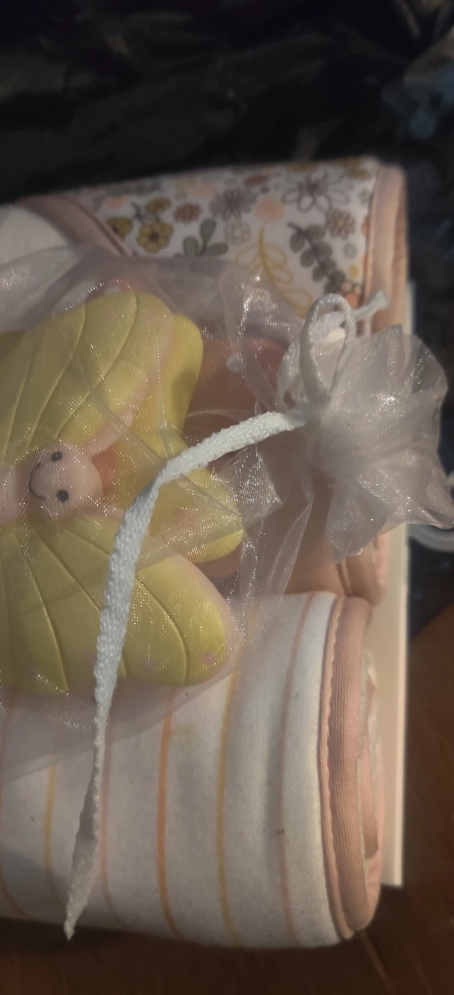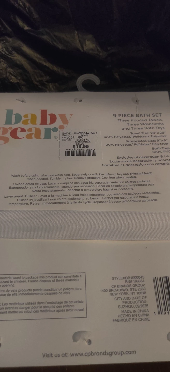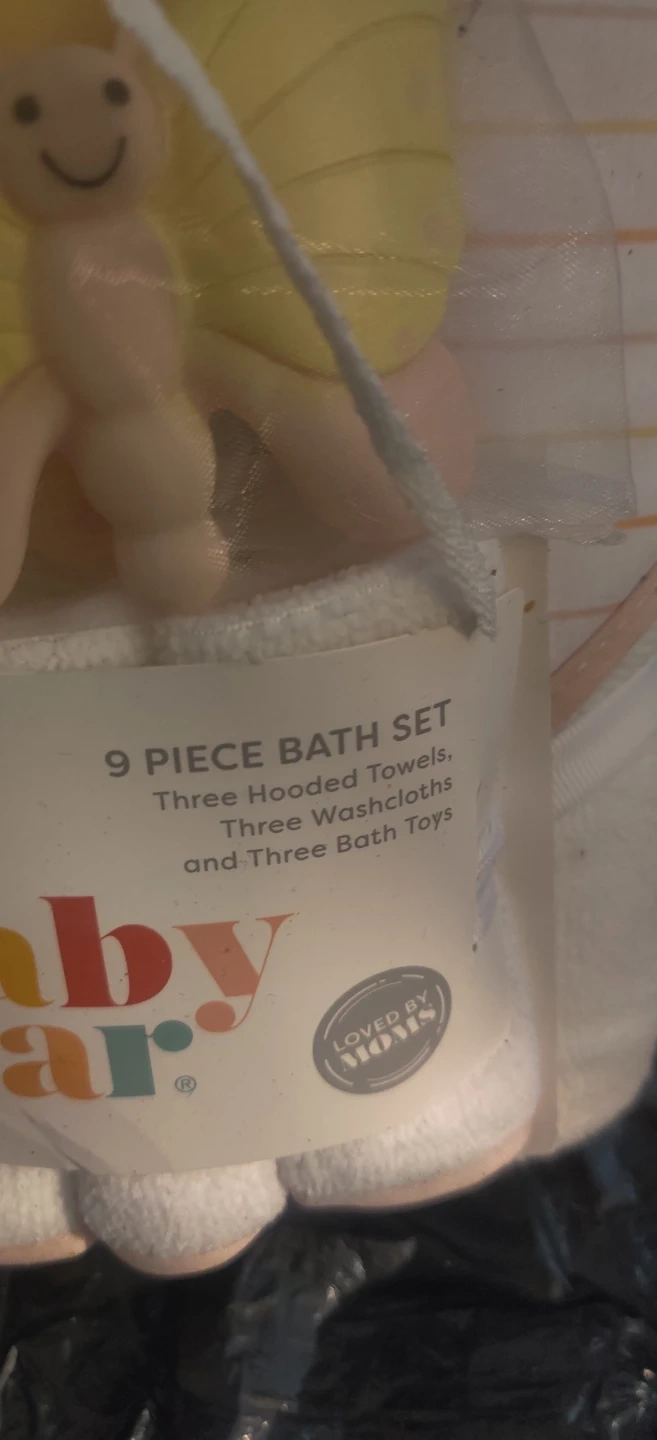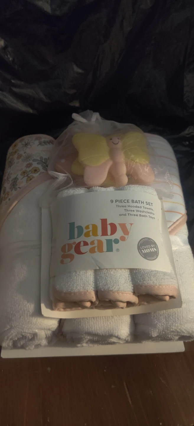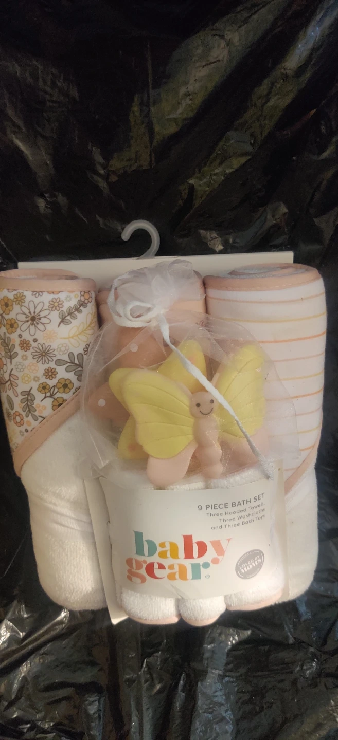 This is a 9 piece bath set from Baby Gear. It includes three hooded towels, three washcloths, and three bath toys. Bath toys include a butterfly design.