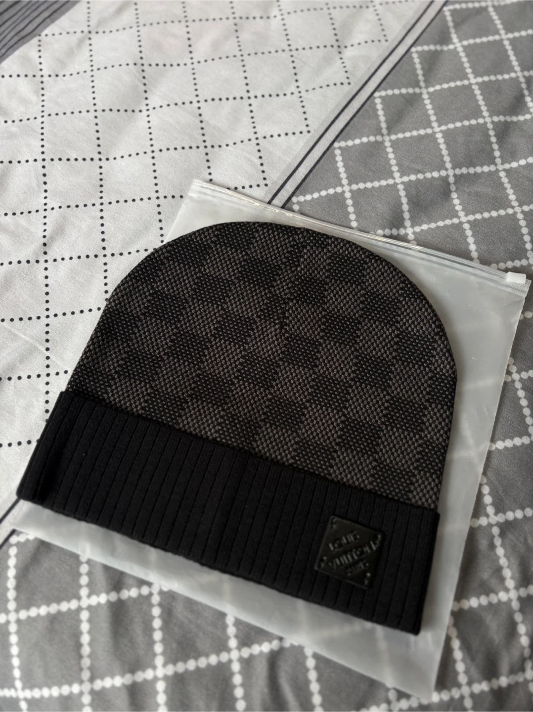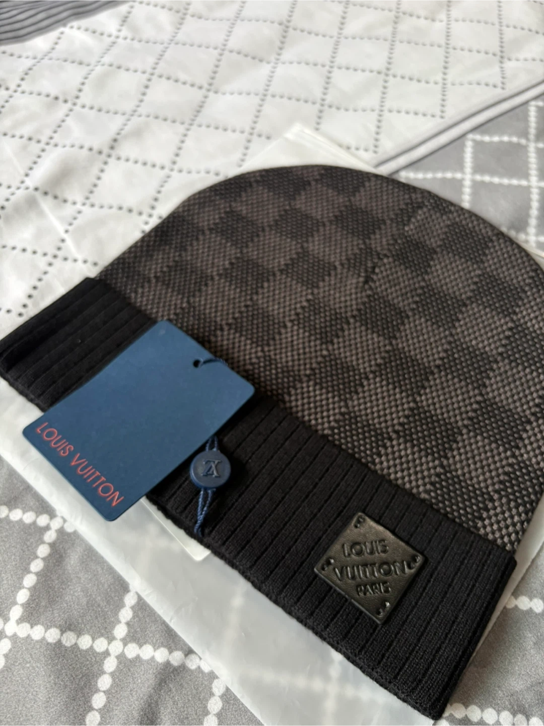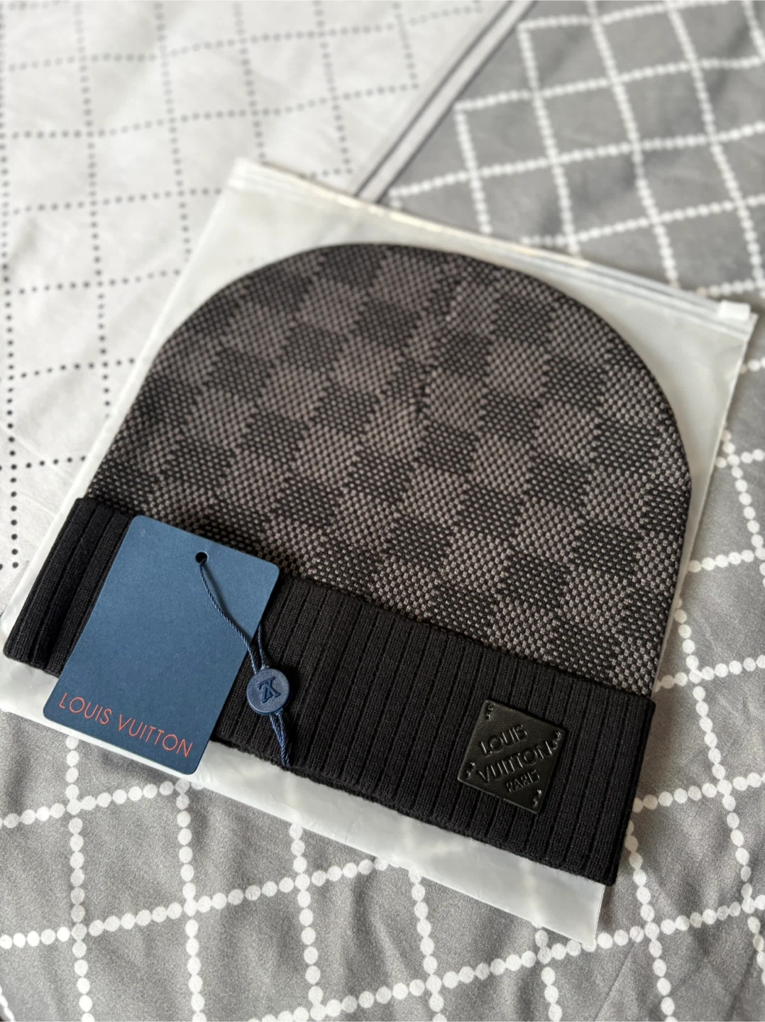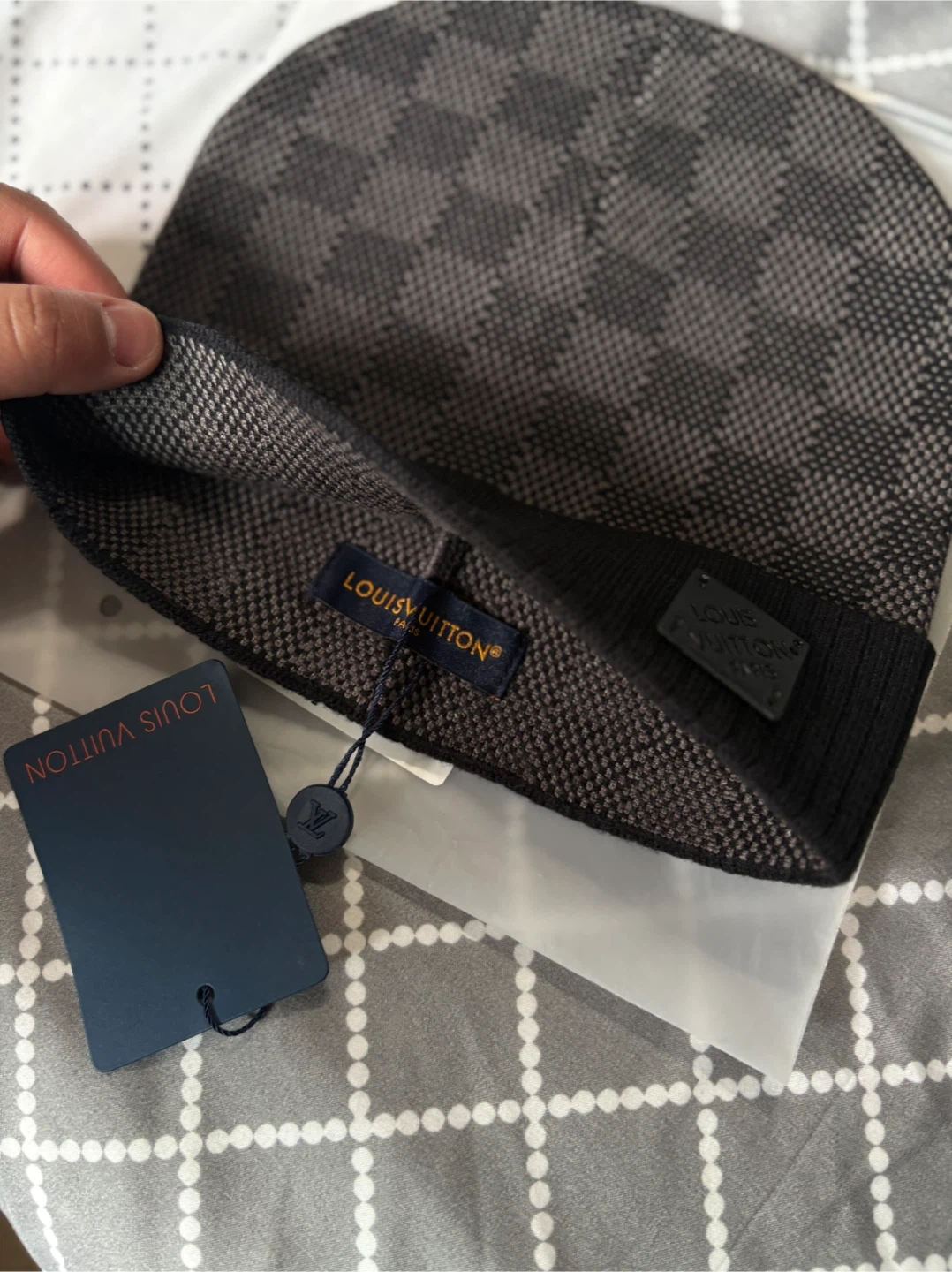 This is a Louis Vuitton beanie featuring the classic Damier checkered pattern. It's made of a knit material with a ribbed black cuff and a black hard badge logo plate. Comes with tags and packaging. I am willing to negotiate if you are serious.