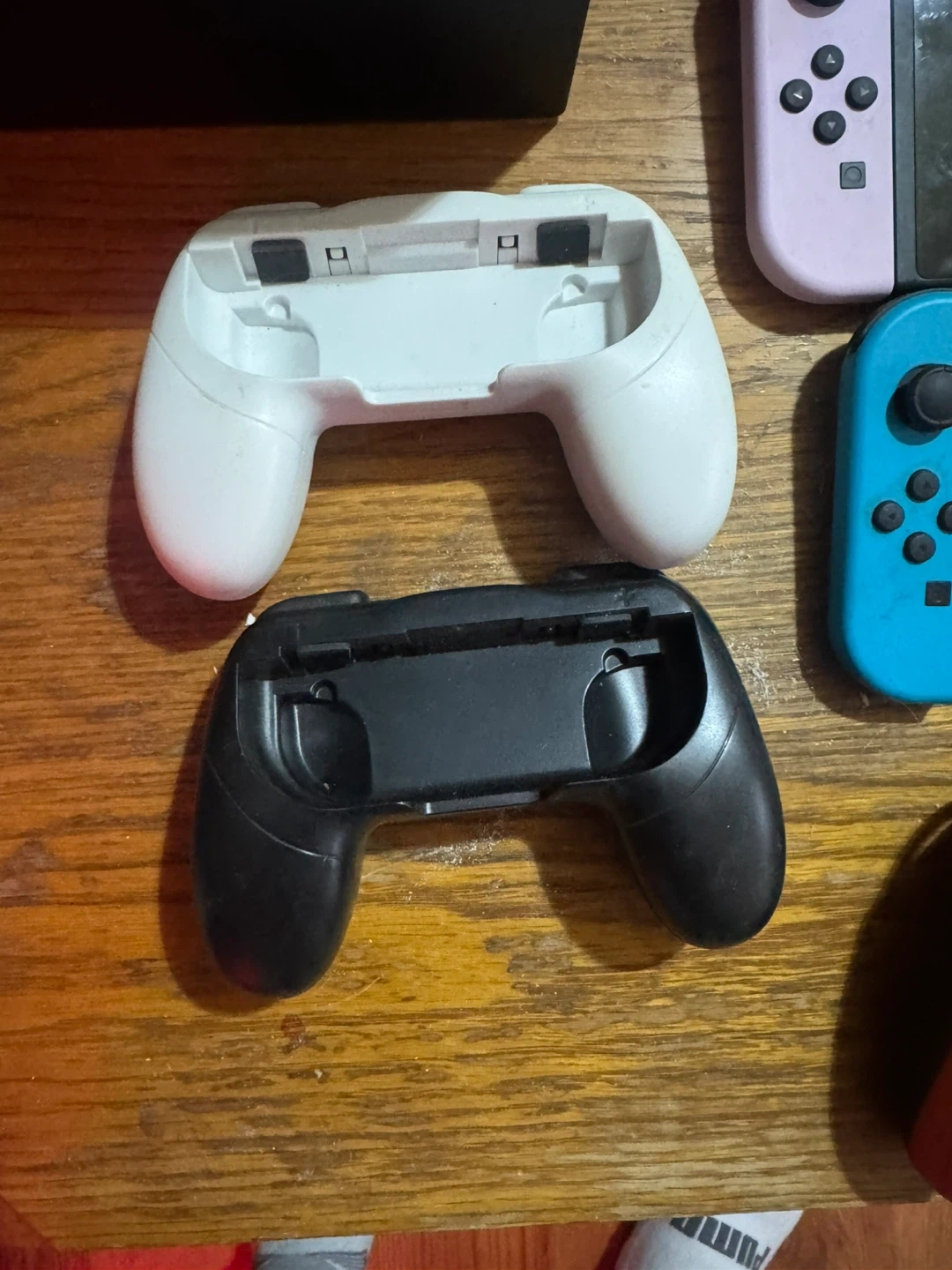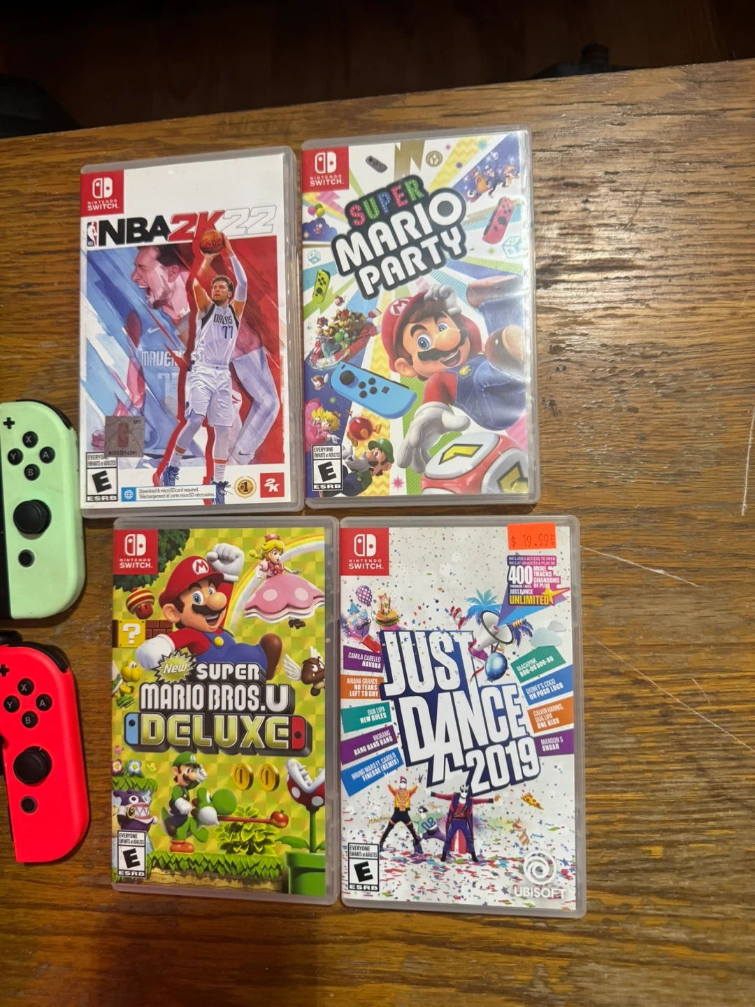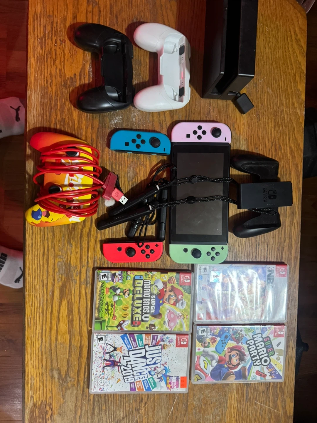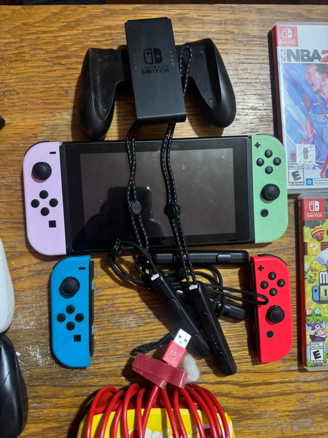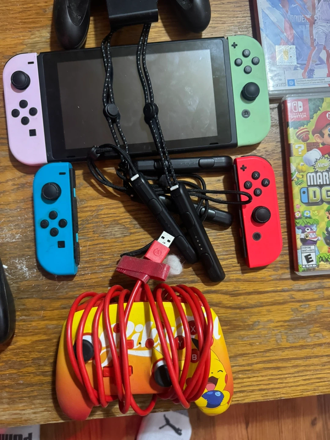 Includes Nintendo Switch console with Joy-Cons, charging grip, and multiple games. Games include NBA 2K22, Super Mario Party, Super Mario Bros. U Deluxe, and Just Dance 2019. Extra controllers and charging cables are also included.