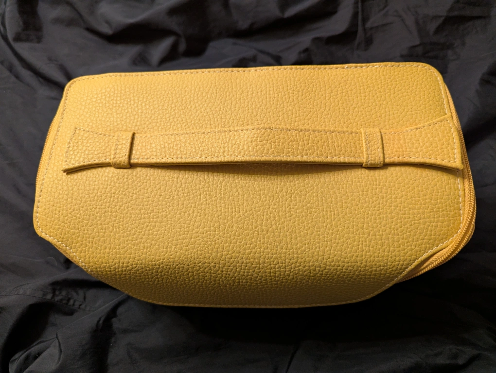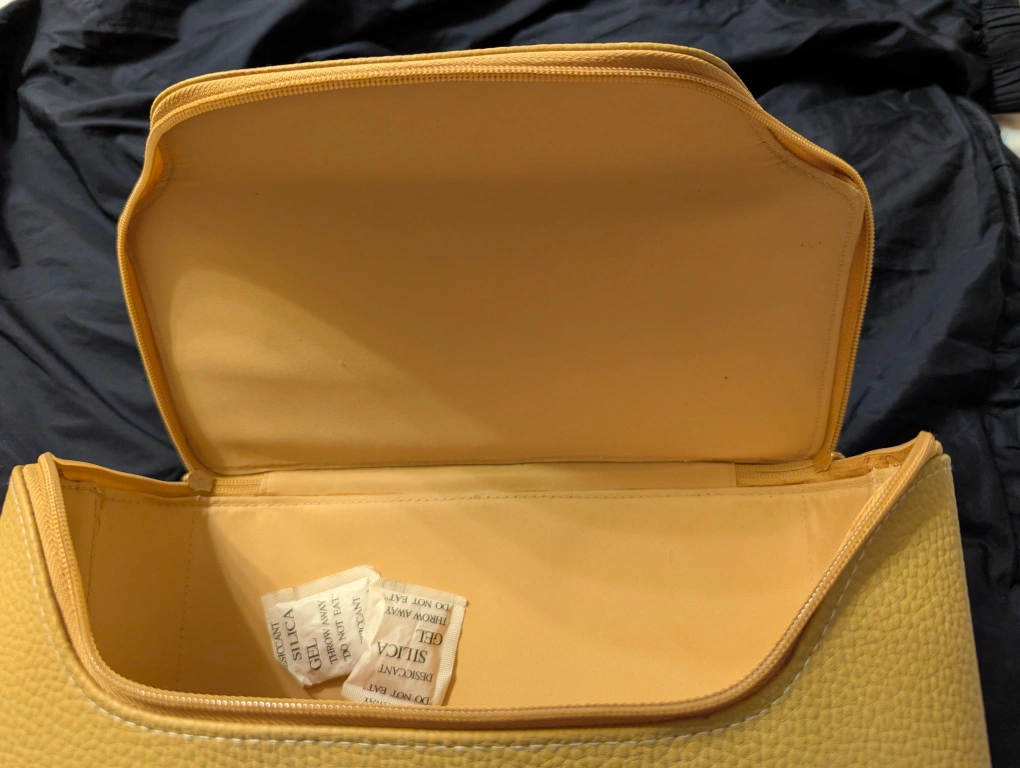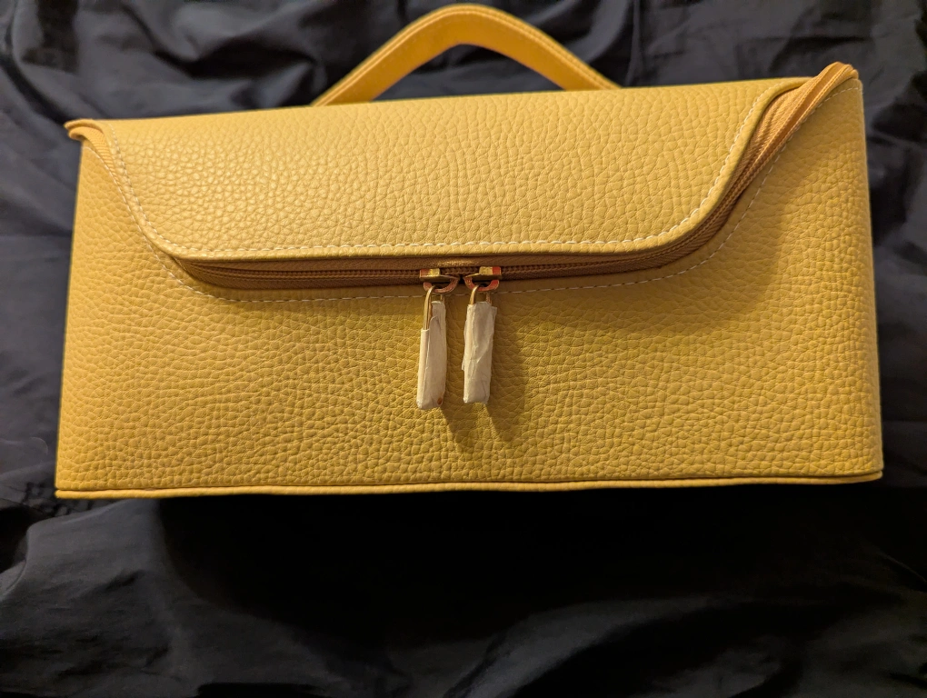 Mustard yellow cosmetic case. Zipper closure. Top handle. Interior lining. Made in China.