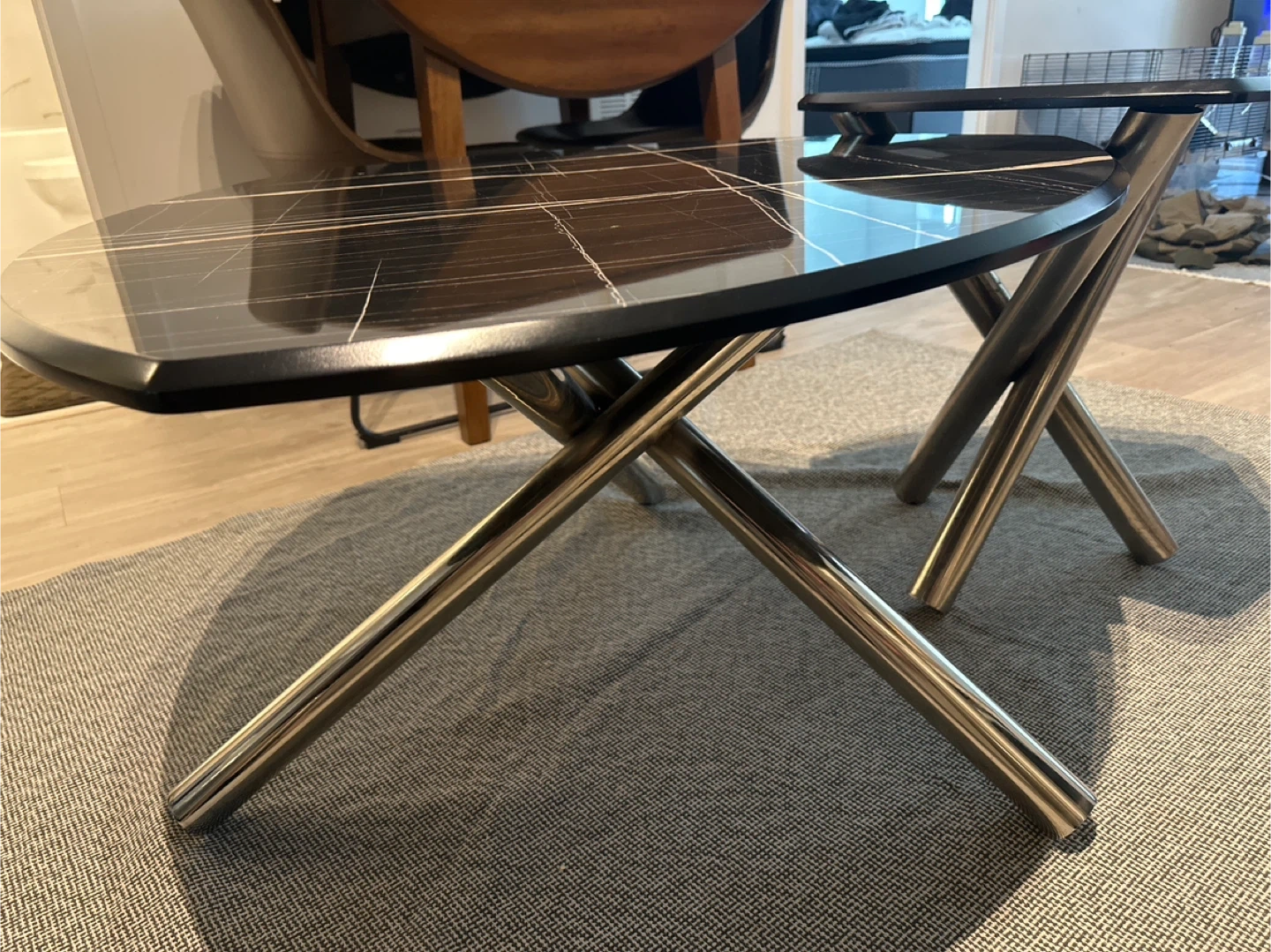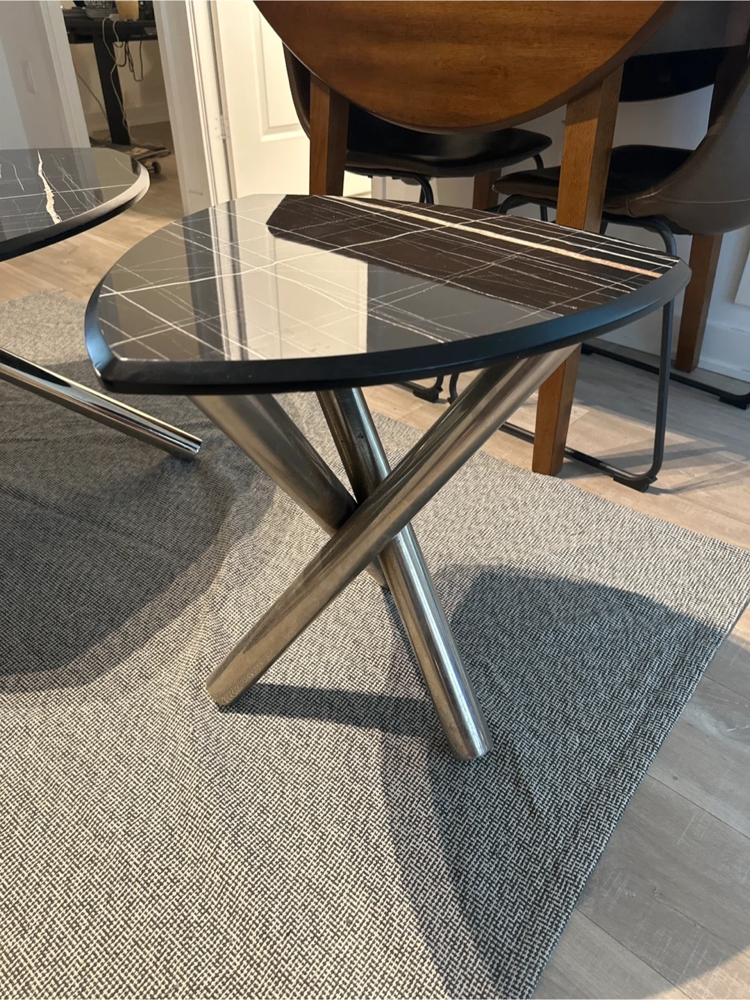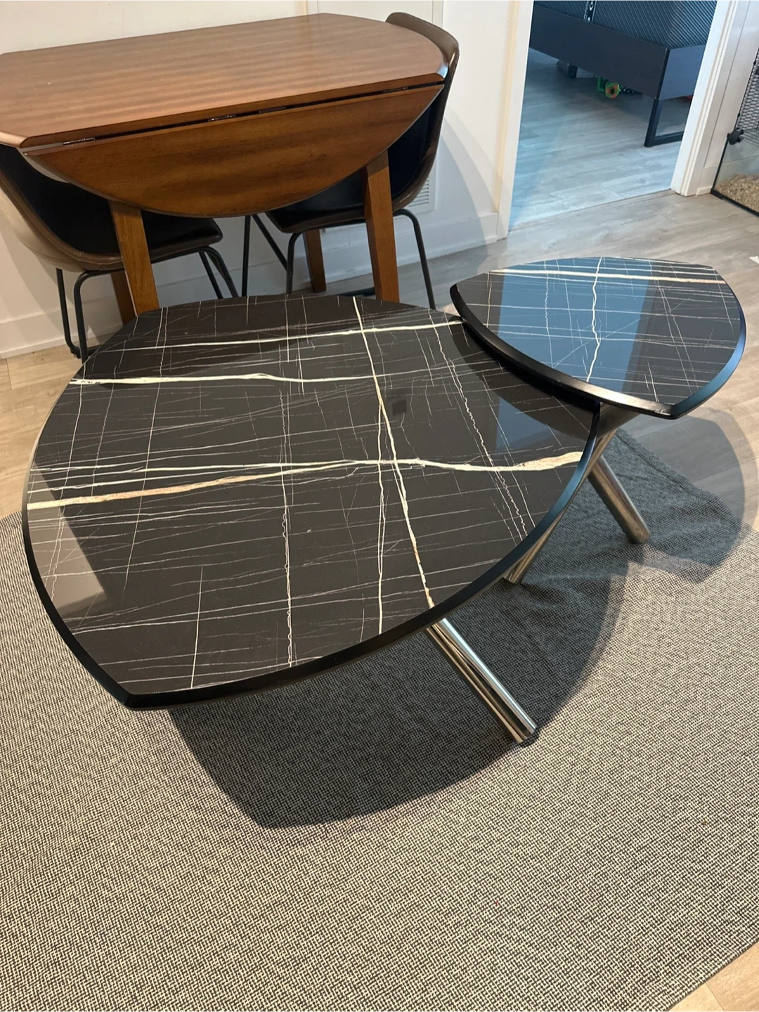 Black marble-style tabletop with metal legs.
