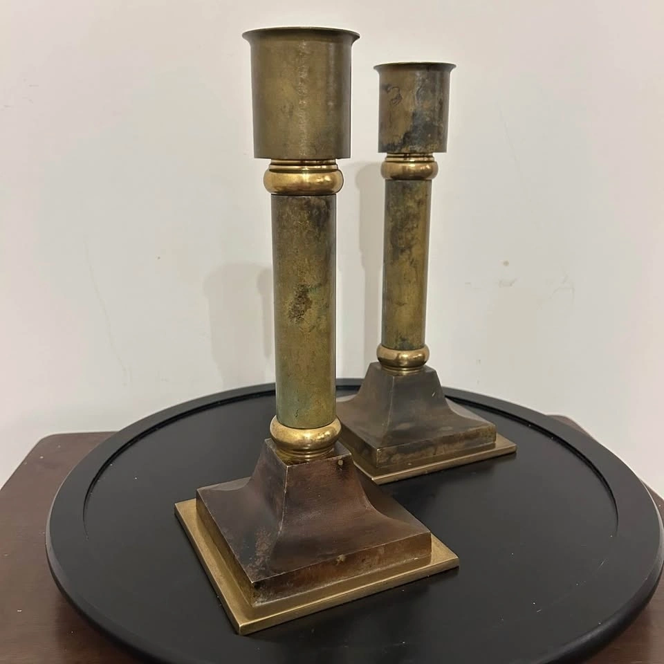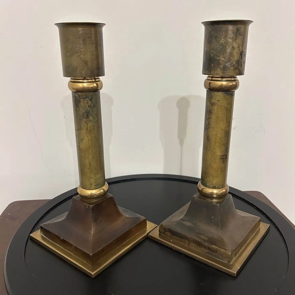 Striking pair of vintage solid brass altar-style candlesticks with a bold neoclassical column design. These are substantial, heavy pieces with excellent stability thanks to their wide, tiered square bases. The elegant proportions and architectural detailing give them a timeless presence, whether styled on a fireplace mantle, dining table, sideboard, or as part of a dramatic centerpiece. The brass has developed a rich, deep natural patina that highlights their authentic age and character. These are not lightweight modern reproductions — they have the weight, craftsmanship, and wear consistent with quality vintage brass. A refined decorative statement for traditional, ecclesiastical, or eclectic interiors. Pick up: Seton area, Calgary. Payment: cash. See also my other lots. Open to your questions and suggestions. If necessary, I provide additional photos. These are not new things, so please look carefully at the photos and videos. Measurements can be seen in the photos.