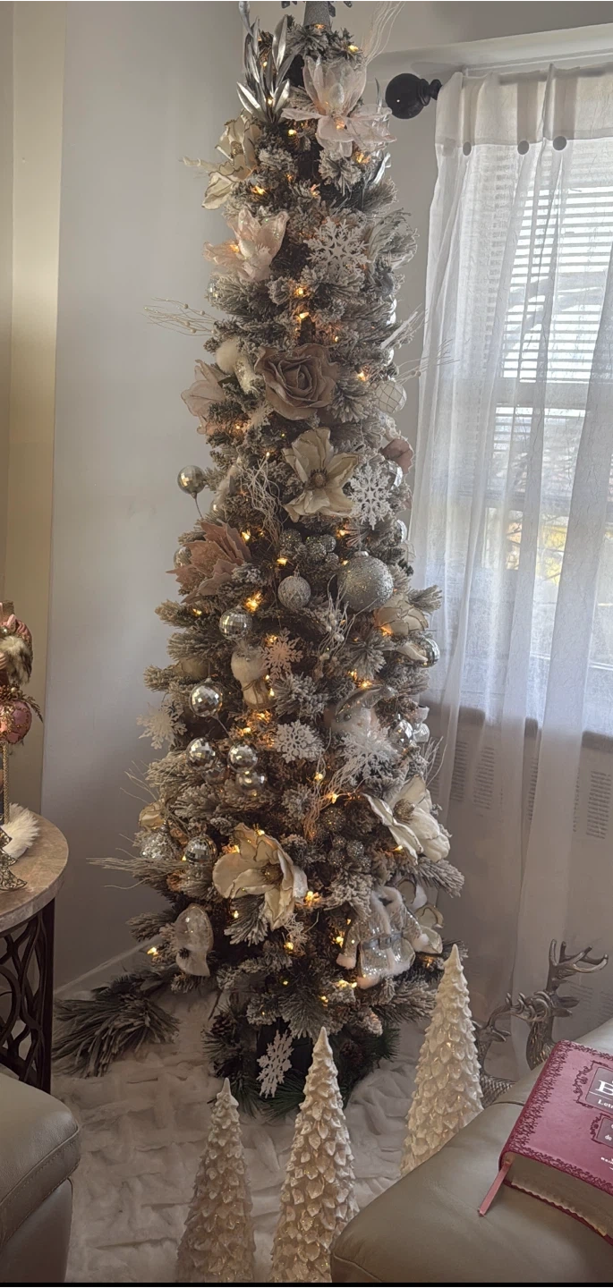 This beautiful flocked Christmas tree comes pre-lit and decorated with large flowers, snowflakes, and silver ornaments. It's a stunning, ready-to-display holiday centerpiece! Perfect for adding a festive touch to your home.