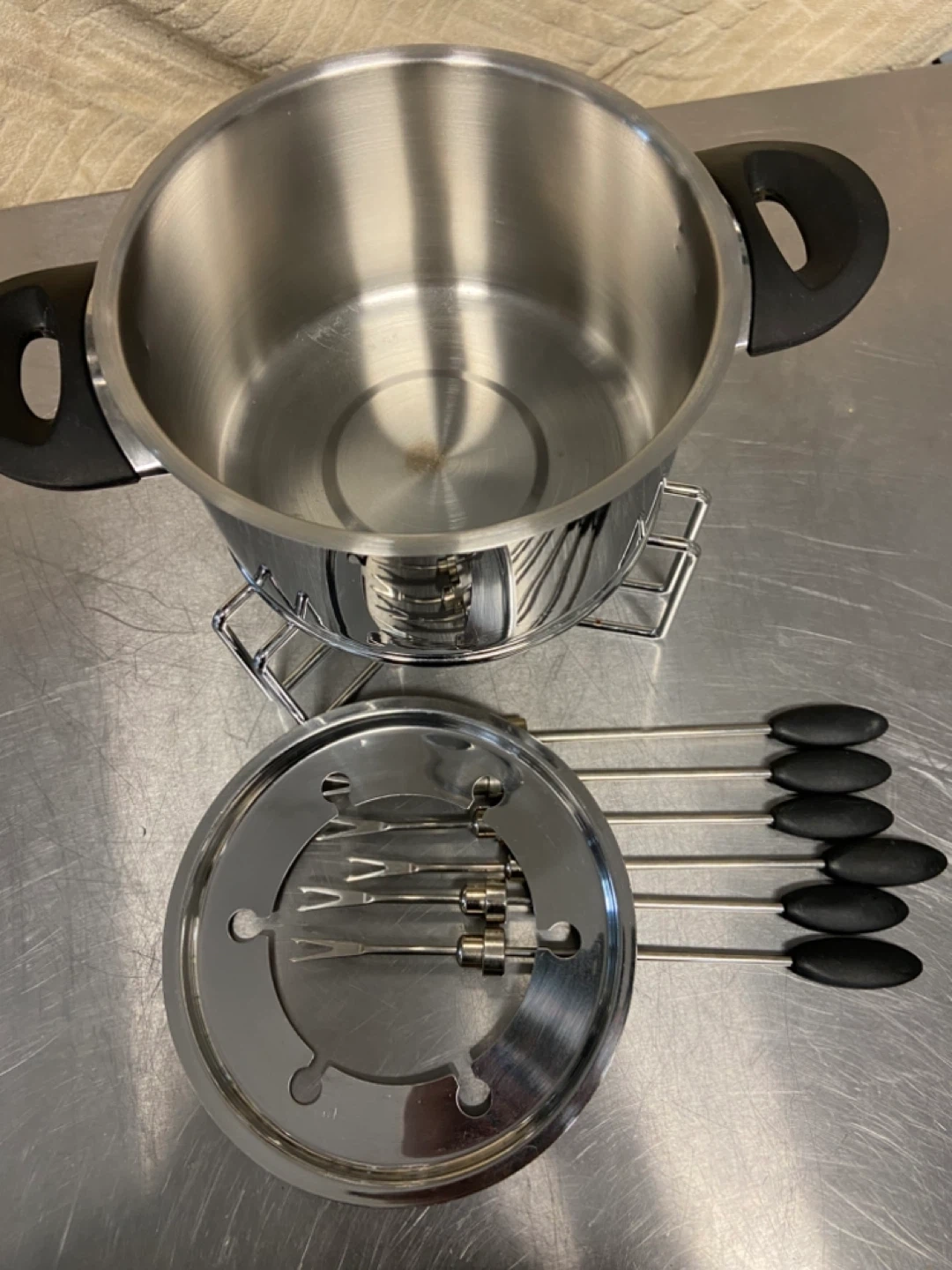 Stainless steel fondue pot includes a stand and 6 fondue forks and fork holder. Excellent condition, durable stainless steel.