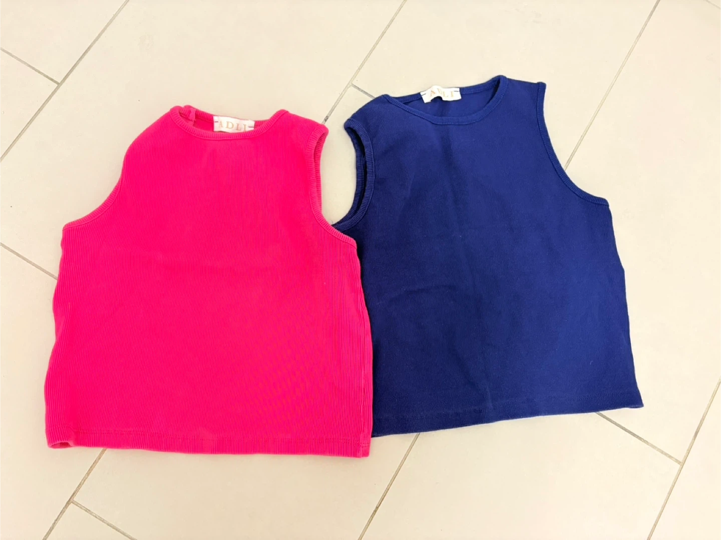Set of two Adli brand tank tops for kids. One is a bright pink ribbed knit, and the other is a solid navy blue. They're great for layering or warm weather. Both appear to be cotton blend.