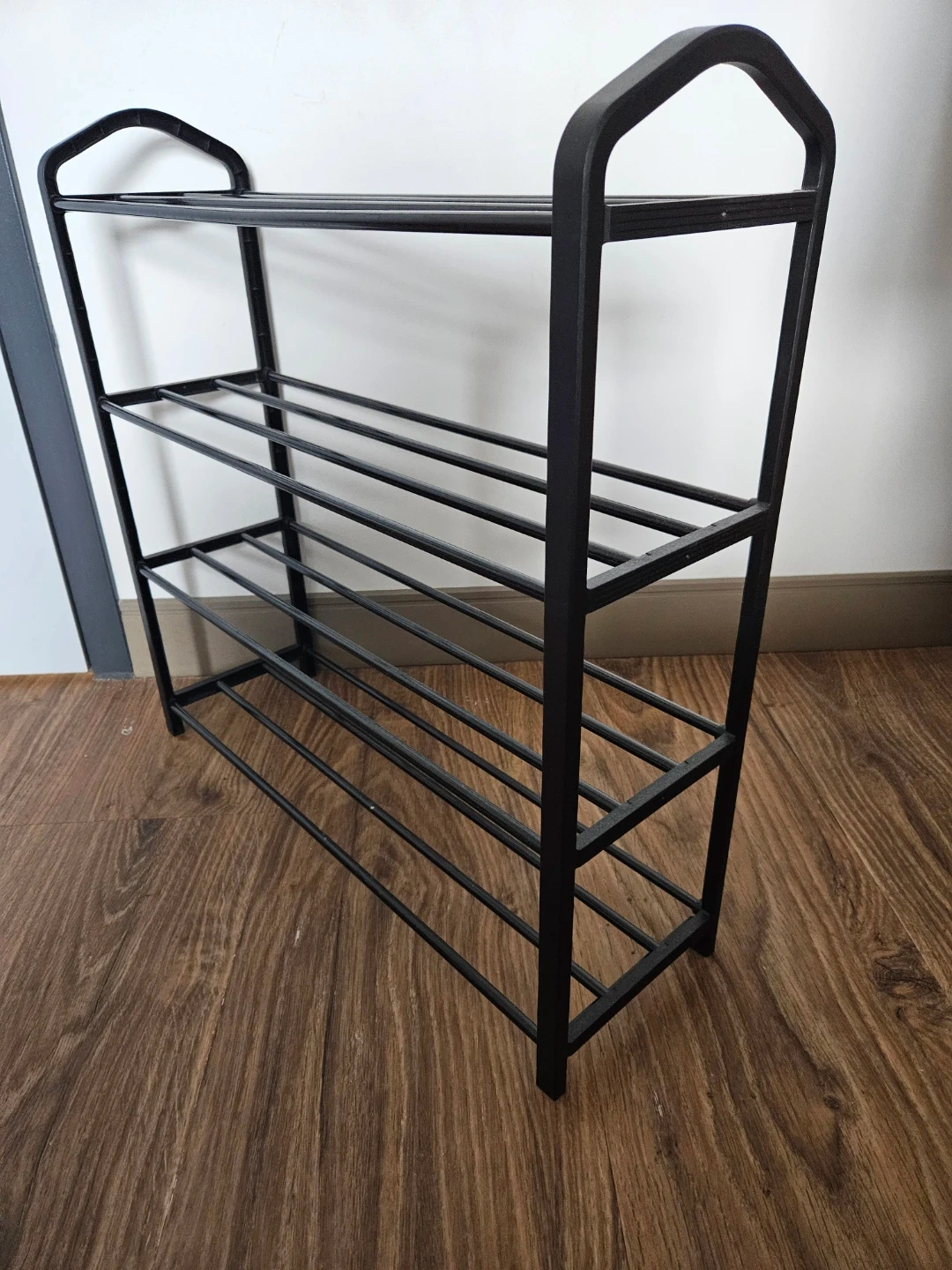 Shoe rack lightly used. Still in perfect condition. Comes apart and goes back together easily. Selling because I don't need it anymore. Roughly 24 inches tall and 24 inches wide.