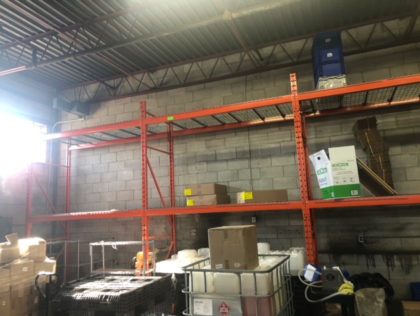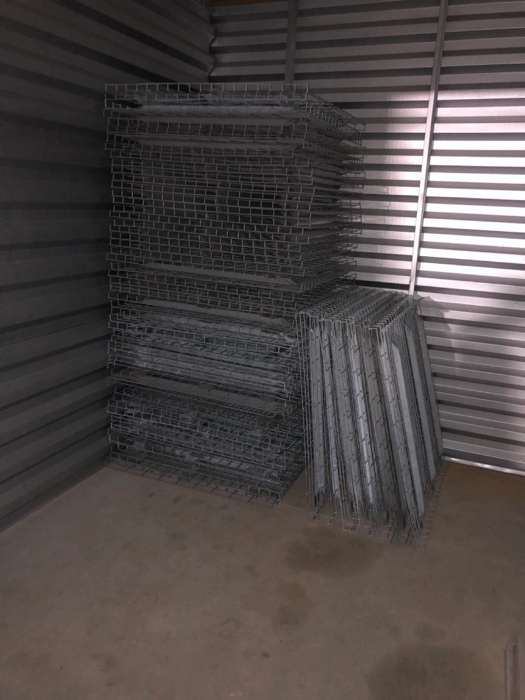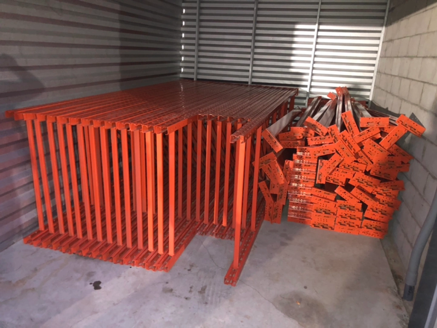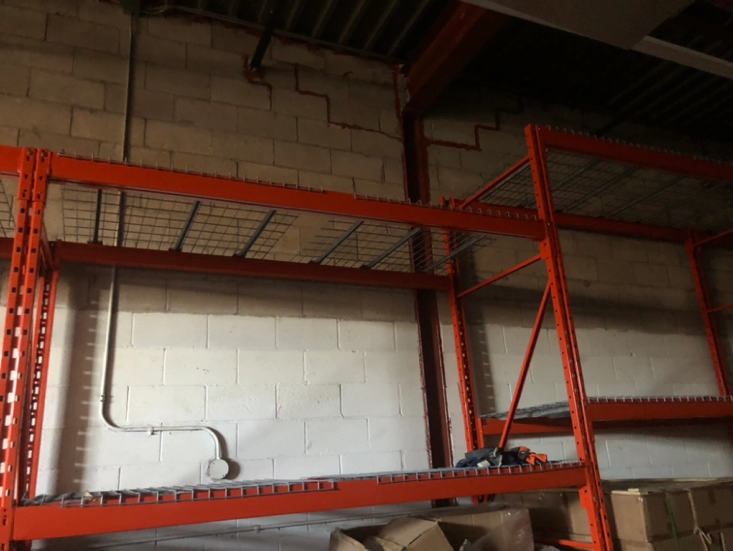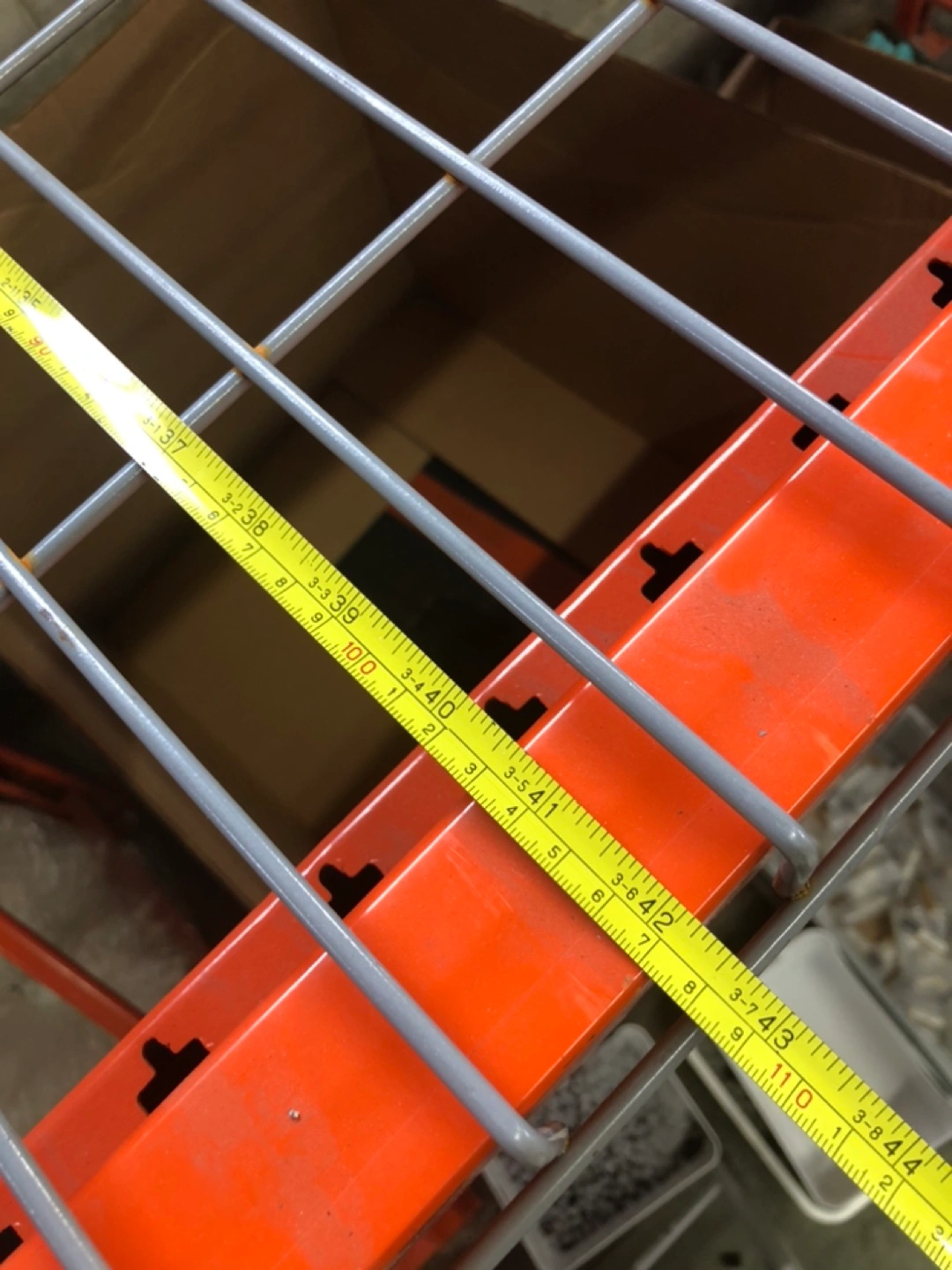 Metal shelving unit. Orange metal frame with wire shelves. Good condition. Great for storage in a garage, basement, or warehouse.